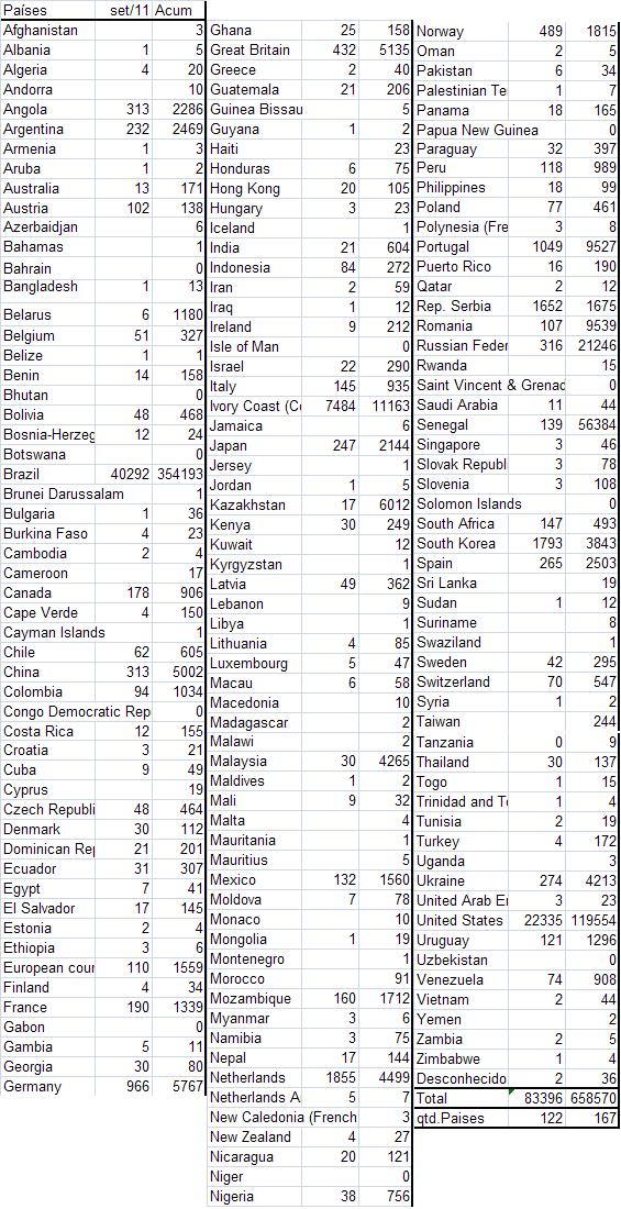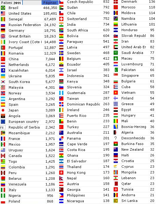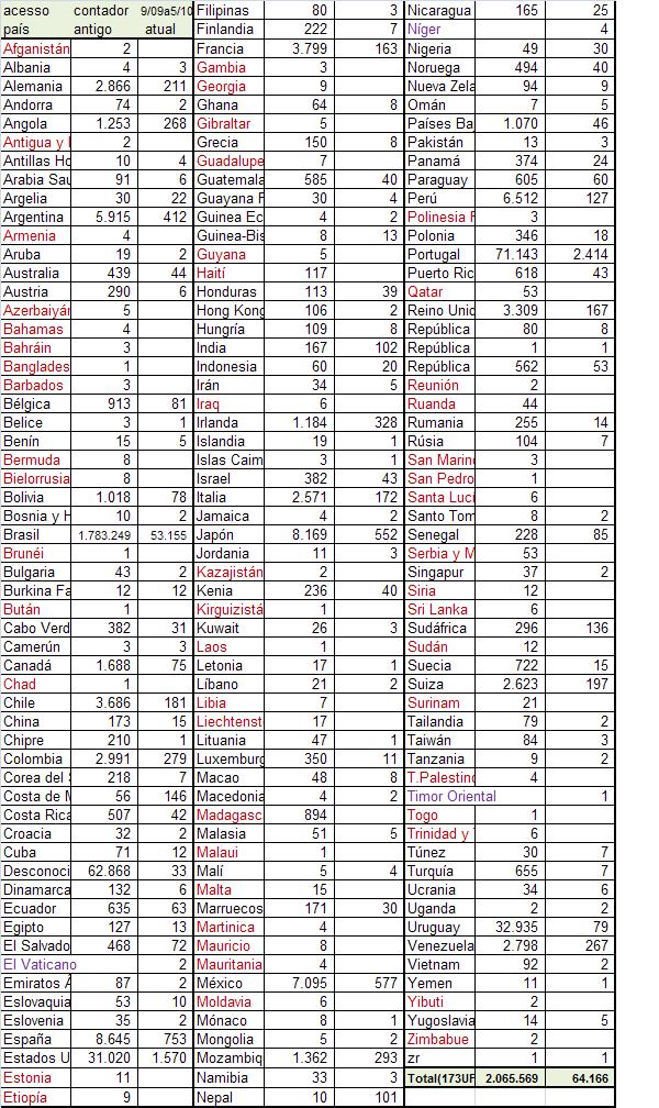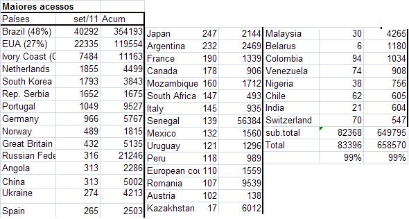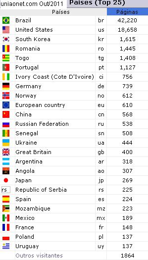 Estatísticas 2011 Estatística de 09/02/2011a24/01/2012 (350dias) : 381.053acessos , 989.935páginas . Médias de : 0,8acess e2pág/Minuto .... (405acess e 118pág/Hora) ... (1.089acess e 2.828pág/dia) Acesso por países : 13 Unidades das 192 , q não configuram em nosso contador de 2011: Bielorrusia _ Burundi _ Chad _ Guayana Francesa _ Guinea Ecuatorial _ Letonia _ Liberia _ Lithuania _ Santo Tomé y Príncipe _ Timor Oriental _ Turkmenistán _ Yibuti _ Zaire . Afghanistan ( 4 ) _ Albania ( 9 ) _ Algeria ( 36 ) _ Andorra ( 21 ) _ Angola ( 3069 ) _ Argentina ( 3292 ) _ Armenia ( 6 ) _ Aruba ( 5 ) _ Australia ( 211 ) _ Austria ( 158 ) _ Azerbaidjan ( 7 ) _ Bahamas ( 4 ) _ Bahrain ( 0 ) _ Bangladesh ( 15 ) _ Barbados ( 3 ) _ Belarus ( 1208 ) _ Belgium ( 412 ) _ Belize ( 1 ) _ Benin ( 233 ) _ Bhutan ( 0 ) _ Bolivia ( 604 ) _ Bosnia-Herzegovina ( 36 ) _ Botswana ( 0 ) _ Brazil ( 46635 ) _ Brunei Darussalam ( 1 ) _ Bulgaria ( 61 ) _ Burkina Faso ( 35 ) _ Cambodia ( 5 ) _ Cameroon ( 18 ) _ Canada ( 1522 ) _ Cape Verde ( 197 ) _ Cayman Islands ( 1 ) _ Chile ( 790 ) _ China ( 7044 ) _ Colombia ( 1291 ) _ Congo Democratic Republic of the ( 0 ) _ Costa Rica ( 195 ) _ Croatia ( 25 ) _ Cuba ( 58 ) _ Cyprus ( 23 ) _ Czech Republic ( 832 ) _ Denmark ( 136 ) _ Dominican Republic ( 263 ) _ Ecuador ( 405 ) _ Egypt ( 48 ) _ El Salvador ( 187 ) _ Estonia ( 16 ) _ Ethiopia ( 14 ) _ European country ( 2972 ) _ Fiji ( 1 ) _ Finland ( 54 ) _ France ( 1971 ) _ Gabon ( 0 ) _ Gambia ( 15 ) _ Georgia ( 141 ) _ Germany ( 18791 ) _ Ghana ( 190 ) _ Great Britain ( 18263 ) _ Greece ( 49 ) _ Guatemala ( 287 ) _ Guinea Bissau ( 5 ) _ Guyana ( 5 ) _ Haiti ( 26 ) _ Honduras ( 95 ) _ Hong Kong ( 173 ) _ Hungary ( 41 ) _ Iceland ( 1 ) _ India ( 734 ) _ Indonesia ( 361 ) _ Iran ( 83 ) _ Iraq ( 14 ) _ Ireland ( 246 ) _ Isle of Man ( 0 ) _ Israel ( 383 ) _ Italy ( 1133 ) _ Ivory Coast (Cote D'Ivoire) ( 14488 ) _ Jamaica ( 8 ) _ Japan ( 3089 ) _ Jersey ( 3 ) _ Jordan ( 14 ) _ Kazakhstan ( 6014 ) _ Kenya ( 348 ) _ Kuwait ( 16 ) _ Kyrgyzstan ( 1 ) _ Latvia ( 497 ) _ Lebanon ( 23 ) _ Libya ( 1 ) _ Lithuania ( 101 ) _ Luxembourg ( 71 ) _ Macau ( 75 ) _ Macedonia ( 17 ) _ Madagascar ( 2 ) _ Malawi ( 2 ) _ Malaysia ( 4301 ) _ Maldives ( 2 ) _ Mali ( 40 ) _ Malta ( 6 ) _ Mauritania ( 2 ) _ Mauritius ( 5 ) _ Mexico ( 1957 ) _ Moldova ( 114 ) _ Monaco ( 10 ) _ Mongolia ( 23 ) _ Montenegro ( 1 ) _ Morocco ( 118 ) _ Mozambique ( 2212 ) _ Myanmar ( 6 ) _ Namibia ( 104 ) _ Nepal ( 160 ) _ Netherlands ( 6172 ) _ Netherlands Antilles ( 8 ) _ New Caledonia (French) ( 3 ) _ New Zealand ( 32 ) _ Nicaragua ( 138 ) _ Niger ( 1 ) _ Nigeria ( 956 ) _ Norway ( 3534 ) _ Oman ( 6 ) _ Pakistan ( 66 ) _ Palestinian Territories ( 8 ) _ Panama ( 201 ) _ Papua New Guinea ( 0 ) _ Paraguay ( 541 ) _ Peru ( 126 ) _ Philippines ( 141 ) _ Poland ( 868 ) _ Polynesia (French) ( 9 ) _ Portugal ( 12887 ) _ Puerto Rico ( 235 ) _ Qatar ( 23 ) _ Republic of Serbia ( 2342 ) _ Romania ( 12329 ) _ Russian Federation ( 24192 ) _ Rwanda ( 15 ) _ Saint Vincent & Grenadines ( 0 ) _ Saudi Arabia ( 77 ) _ Senegal ( 67489 ) _ Singapore ( 65 ) _ Slovak Republic ( 86 ) _ Slovenia ( 324 ) _ Solomon Islands ( 0 ) _ South Africa ( 620 ) _ South Korea ( 5677 ) _ Spain ( 3265 ) _ Sri Lanka ( 20 ) _ Sudan ( 792 ) _ Suriname ( 11 ) _ Swaziland ( 1 ) _ Sweden ( 468 ) _ Switzerland ( 752 ) _ Syria ( 10 ) _ Taiwan ( 287 ) _ Tanzania ( 11 ) _ Thailand ( 174 ) _ Togo ( 1425 ) _ Trinidad and Tobago ( 5 ) _ Tunisia ( 22 ) _ Turkey ( 227 ) _ Uganda ( 3 ) _ Ukraine ( 5835 ) _ United Arab Emirates ( 82 ) _ United States ( 185481 ) _ Uruguay ( 1624 ) _ Uzbekistan ( 0 ) _ Venezuela ( 1186 ) _ Vietnam ( 55 ) _ Yemen ( 3 ) _ Zambia ( 5 ) _ Zimbabwe ( 7 ) Em 2011: 7.891 paginas foram