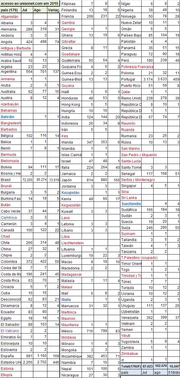 02/06/2010- Relação de 173 países que já acessaram o uniaonet.com