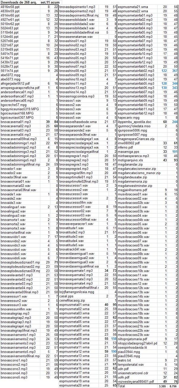 Visitantes únicos : 26.720 Numero de visitas : 34.566 (1.29 visitas/visitante) 7.846 visitantes acessam mais de uma vez . Páginas : 83.416 (2.41 Páginas/Visita) Tráfego não visualizado * 110,297 * Tráfego "não visto" é tráfego gerado por robots, worms ou respostas a códigos de status HTTP especiais. 122 países acessaram o uniaonet em set/11 e no acumulado 167. de 192 territórios , faltando apenas 25 unidades acessarem o Portal . Maiores Países em qtd de origem de acessos : Arquivos Baixados : Downloads de 268 arquivos : Setembro/2011 e Acumulado espmusmetainfab06.mp3 ( 130 ) - ( 343 ) Quem Foi q Fez o Cachorrinho espmusmetainfab05.mp3 ( 128 ) - ( 344 ) Pega Daqui Corre dali espmusmetainfab02.mp3 ( 122 ) - ( 367 ) Força Jovem é de adolescente ibppembu_apostila.doc ( 60 ) - ( 244 ) espmusmeta12.wma ( 59 ) - ( 190 ) Aniversário espmusmeta09.wma ( 55 ) - ( 158 ) Servo vozwesleyana080401.pdf ( 49 ) - ( 76 ) motigoarquivo.xls ( 43 ) - ( 93 ) espmusmeta01.wma ( 40 ) - ( 95 ) Metamorfose bnovacaverna01.mp3 ( 39 ) - ( 84 ) uofn.pdf ( 37 ) - ( 82 ) bnovaxequemate1.mp3 ( 34 ) - ( 73 ) imw080902.pdf ( 33 ) - ( 61 ) maoamiga.pps ( 33 ) - ( 101 ) Páginas acessadas : O uniaonet tem aproximadamente 4.730 páginas , o contador identificou 1.824 (40%) ficando sem contabilizar 2.906 páginas (60%) . .20.611