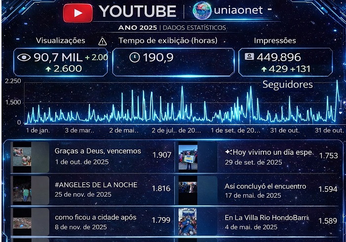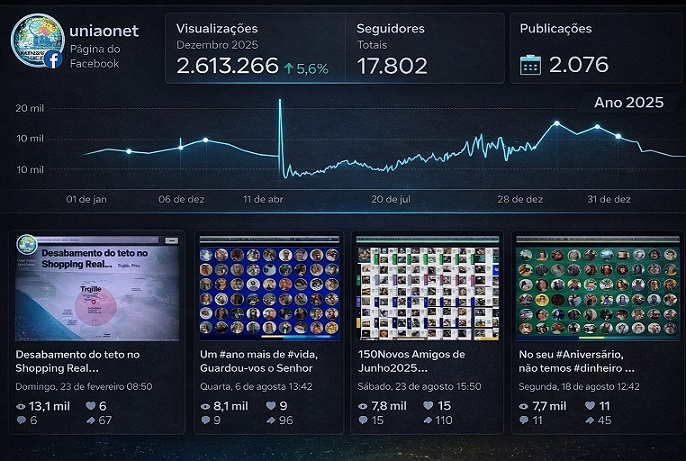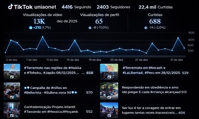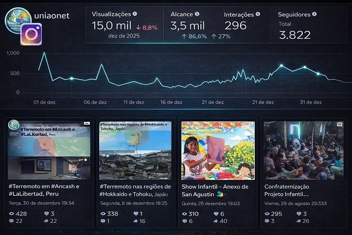 Participantes : 3.822 Visualizações : 15.000 (536/dia) Alcance : 3.500 Conteúdo : 428 - #Terremoto em #Ancash e #LaLibertad, #Peru em 28/12/2025 338 - #Terremoto nas regies de #Hokkaido e #Tohoku , #Japo 08/12/2025 310 - Show Infantil Anexo de San Agust Movimento Missioneiro Mundial 295 - Confraternizao Projeto Infantil #Tawanda em #Messica/#Moambique