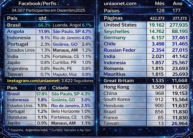 Participantes : 34.567+723 Visualizações : 197.300 (7.046/dia) Brasil 66.3% Angola 11.9% Indonsia 5.6% Moambique 2.7% Portugal 2.3% Estados Unidos 1.3% ndia 1% Japo 0.9% Argentina 0.8% Taiwan 0.7% Luanda, Angola 6.1% So Paulo, SP 4.7% Rio de Janeiro, RJ 3.3% Goinia, GO 2.4% Belo Horizonte, MG 1.3% Manaus, AM 1.2% Fortaleza, CE 1.2% Curitiba, PR 1.0% Recife, PE 0.8% Maputo, Moz 0.8% www.instagram.com/uniaonet, Estatísticas Dezembro 2025 : 3.822Seguidores Brasil 57.8% Indonsia 1.8% Estados Unidos 1.5% Portugal 1.3% Angola 1.2% Moambique 0.9% Japo 0.9% Espanha . Argentina e ndia So Paulo, SP 4.3% Goinia, GO 3.0% Rio de Janeiro, RJ 2.5% Belo Horizonte, MG 1.5% Fortaleza 1.0% Manaus, AM 1.1% Luanda, Angola 1.0% Curitiba, Salvador e Ap Gyn Portal : www.uniaonet.com Estatísticas Dezembro 2025 : Pases: Pases 128mes , 177acumulado Pginas Acessadas : 422.373mes , 4.298.348acumulado Acessos no Ano : United States 277.935 Russian Federation 110.143 Seychelles 88.195 India 41.142 Germany 37.465 Chile 35.402 Taiwan 26.964 Indonesia 25.562 Canada 19.668 South Korea 19.533 China 19.251 Egypt 16.837 Great Britain 16.015 Honduras 15.566 France 13.891 Hong Kong 11.865 Vietnam 9.561 Ukraine 9.395 Iran 9.236 Poland 8.559 Republic of Serbia 8.382 Romania 7.693 Japan 7.670 Mauritius 7.596 Brazil 7.306 Philippines 5.950 Australia 4.700 European country 4.396 Saudi Arabia 4.363 Turkey 4.102 Israel 3.491 Netherlands 3.021 Spain 2.984 Cambodia 2.932 Sweden 2.493 Angola 2.472 Denmark 2.392 Lithuania 2.124 Czech Republic 2.074 Estonia 2.018 Italy 1.915 Singapore 1.883 Moldova 1.830 Latvia 1.825 Hungary 1.712 Lebanon 1.708 South Africa 1.576 Bangladesh 1.422 Thailand 1.409 Switzerland 1.395 Belize 1.388 Bulgaria 1.257 Malaysia 1.231 Argentina 1.200 Desconhecido 1.074 New Zealand 788 Oman 786 Greece 785 Austria 737 Azerbaijan 727 Morocco 659 Belgium 608 Costa Rica 515 Jordan 514 Ireland 489 Slovenia 470 Mexico 447 Mozambique 440 Uzbekistan 347 Portugal 288 Colombia 267 Ecuador 267 Norway 266 Bosnia-Herzegovina 260 Nepal 251 Kenya 185 Algeria 160 Luxembourg 159 Pakistan 158 Iraq 154 Virgin Islands (British) 147 Panama 124 Venezuela 113 Curacao 111 Kazakhstan 108 Finland 98 Uruguay 93 United Arab Emirates 81 Peru 81 Mongolia 72 Malta 64 Belarus 61 Afghanistan 51 Tunisia 50 Paraguay 47 Kyrgyzstan 44 Iceland 40 Bolivia 34 Cyprus 33 Nigeria 33 Albania 33 Croatia 31 Bahrain 23 Senegal 23 Slovak Republic 22 Guatemala 22 Cameroon 22 Georgia 22 Dominican Republic 19 Armenia 17 Palestinian Territories 17 Jamaica 16 Guinea Bissau 16 Swaziland 16 Nicaragua 15 Kuwait 15 Namibia 13 Syria 12 Mali 10 El Salvador 9 Haiti 9 Tanzania 9 Sri Lanka 8 Laos 7 Trinidad and Tobago 7 Cuba 7 Burkina Faso 7 Myanmar 6 Rwanda 6 Benin 6 Puerto Rico 5 Macedonia 5 Equatorial Guinea 5 Brunei Darussalam 5 Lesotho 4 Guyana 4 Uganda 4 Qatar 4 Liberia 4 Vanuatu 3 Montenegro 3 Barbados 3 Botswana 2 Yemen 2 Macau 2 Papua New Guinea 2 Ghana 2 Gabon 2 Congo, Democratic Republic of the 1 Turkmenistan 1 Congo 1 Somalia 1 Monaco 1 Zimbabwe 1 Andorra 1 Guinea 1 Saint Vincent & Grenadines 1 Fiji 1 Sint Maarten 1 Tadjikistan 1 Vatican City State 1 New Caledonia (French) 1 Anguilla 1 Suriname 1 Grenada 1 Jersey 1 Burundi 1 Mauritania 1 Sao Tome and Principe 1 Micronesia 1 Libya 1 Aruba 1 Cape Verde 1 Sudan 1 Virgin Islands (USA) 1 Maldives 1 |