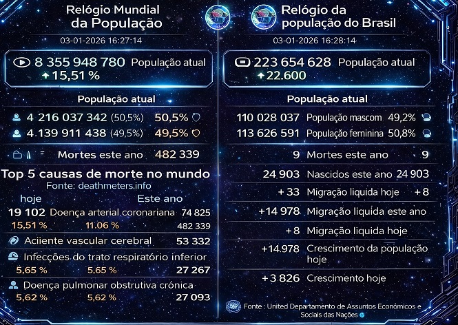 #PopulaoMundial em 31-10-2025 8 336 990 536 Populao atual 4 206 471 861 Populao masculina atual (50.5%) 4 130 518 675 Populao feminina atual (49.5%) Top 3 causas de morte no mundo Este ano Doena arterial coronariana 15.51 % _ 8 352 515 Acidente vascular cerebral 11.06 % _ 5 953 314 Infeces do trato respiratrio inferior 5.65 % _ 3 043 685 == Relgio da populao do Brasil 223 300 558 Populao atual 109 853 850 Populao masculina atual (49.2%) 113 446 708 Populao feminina atual (50.8%) 2 789 367 Nascidos neste ano 5 790 Nascidos hoje 1 115 378 Mortes este ano 2 315 Mortes hoje Crescimento da populao este ano 1 678 824 Crescimento da populao hoje 4 630 Fonte : United Departament