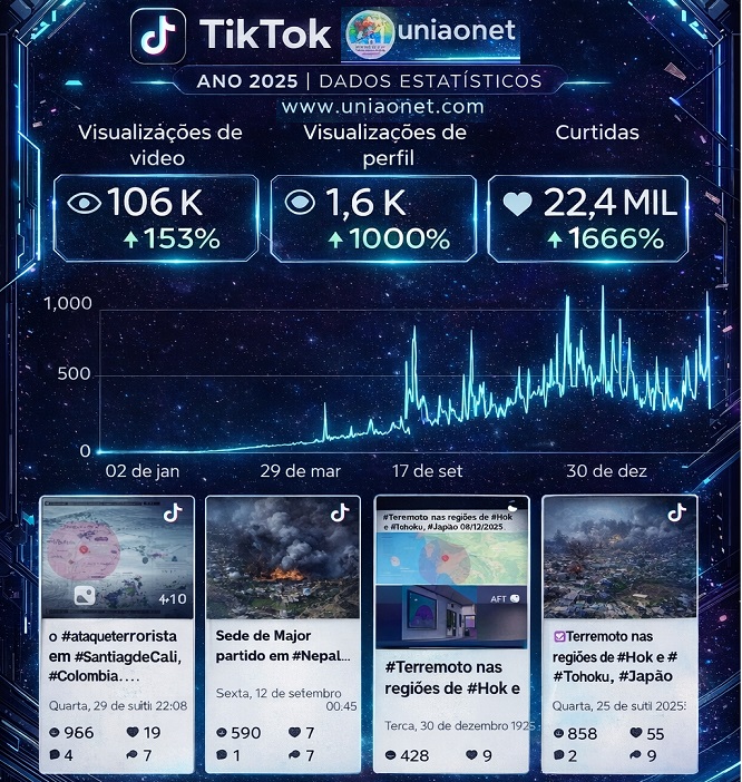 Participantes : 3.822 Visualizações : 82.900 (230/dia) Alcance : 20.700 Conteúdo : 691 - Furacão St. #Elizabeth, #Jamaica 28/10/2025 Um rastro de destruio 540 - Sede do Maior partido do #Nepal foi #incendiado parlamento e residencias 428 - #Terremoto em #Ancash e #LaLibertad, #Peru em 28/12/2025 412 - O Rio precisa das nossas oraes. Operação Policial out2025