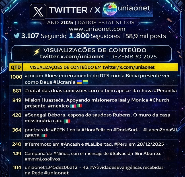 Participantes : 1.800 1000 _ #jocum #kiev encerramento do DTS com a Bblia presente ver como Deus #Ucrania 881 _ #natal das duas comisses correu bem apesar da chuva #Peronika #Indonesia 849 _ Mision Huasteca. Apoyando misioneros Isa y Monica #Church presente. #mexico 420 _ #Senegal Dbora, esposa do saudoso Rubens. O muro da casa missionria caiu 364 prcticas de #ECEN 1 en la #HoraFeliz en #DockSud. . #LapenZonaSUDOESTE. 240 _ #Terremoto em #Ancash e #LaLibertad, #Peru em 28/12/2025 149 _ Campaa de #Nios, con el mensaje de #Salvacin Eni Abanto. #mmmlosolivos 104 _ uniaonet1345dez06a12 - 42 #AtividadesEvanglicas recebidas na Rede #uniaonet
