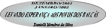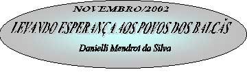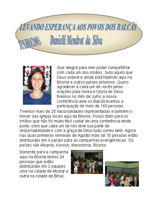OM BRASIL R: Manoel Bosco Ribeiro, 426 Jd. Das Industrias São José dos Campos SP CEP: 12241-070 Brasil DANIELLI MENDROT DA SILVA Ljubljanska 26 - 71000 SARAJEVO BOSNIA-HEZERGOVINA BANCO BRADESCO Agência:1960-7 Conta Poupança:25302-2 BANCO CAIXA EC. FEDERAL Agência:1634 Conta Poupança:25962-6 10/05 Olá amados em Cristo Jesus! "E não vos conformeis com este mundo, mas transformai-vos pela renovação do vosso entendimento para que experimentais qual seja a boa, agradável e perfeita vontade de Deus" (Rm 12:02). Como é maravilhoso experimentar a boa, agradável e perfeita vontade de Deus. É um presente gratuito para todos nós, e eu não poderia deixar de vos encorajar através daquilo que o Senhor tem feito comigo aqui na escola. Esta semana saiu uma reportagem sobre três pais que mataram seus filhos drogados, fiquei indignada e não quero me conformar com isso. A escola que estou trabalhando visa levantar obreiros para ajudar na recuperação de drogaditos e alcoólatras, vale a pena investir, tenho visto testemunhos de vários drogaditos que se recuperaram, o que falta são obreiros capacitados para este trabalho. A visão da escola é treinar pessoas para desenvolver ou trabalhar num centro de recuperação de drogaditos e alcoólatras, isso faz o Reino crescer. Orem por esta escola, creio que primeiro nasceu no coração de Deus e a visão é expandir. Deus tem desafiado os alunos a estarem levantando um ministério de recuperação na suas igrejas, fico feliz, pois a visão é essa, meu desejo é que Deus os direcione no tempo e modo de Deus. Quanto ao meu remédio não consegui aqui em Curitiba, tive que viajar para Campo Grande, fui dia 21/04 e retornei dia 25/04. Lá consegui meu remédio para dois meses, mas terei que ir a cada dois meses buscar, sai mais barato buscar do que comprar, custa R$700,00 cada caixa e eu uso duas caixas mensais. Tive também oportunidade de rever meus pais, e foi um tempo ótimo de restauração, Deus tem me usado como conselheira da família. Uma porta se fecha e outra se abre pois Deus está no controle. Meu médico está surpreso com a minha recuperação tão rápida, ele reconheceu a ação de Deus em minha vida, fiquei muito alegre com isso, meu testemunho tem impactado. Louvado seja Deus!!! Obrigada por suas orações, pois minha vitória também é sua! Quanto à Bósnia tenho uma notícia para que possamos orar. O governo da Bósnia decidiu expulsar todas as pessoas morando em casas ou apartamentos ocupados durante a guerra, é o fim dos centros de refugiados, a situação para centenas de famílias piorou obrigando-as a voltarem para casas semi-destruídas ou inacabadas. O desafio de ir para a Bósnia continua, mas estou buscando o tempo de Deus. Amados , estar no centro da vontade de Deus é frutífero, tudo é abençoado e da certo. Escolha também buscar isso para sua vida. Experimente dar sua agenda para Deus, dê todas as partes do seu coração e do seu tempo a Deus e deixe que ele lhe diga o que fazer, aonde ir, quando e onde retribuir. Deus não quer que você se destrua; exaustão, esgotamento e depressão não são sintomas de que você está fazendo a vontade de Deus. Deus é delicado e amoroso, Deus deseja dar-lhe um sentido profundo de segurança no seu amor, quando tiver permitido a você mesmo vivenciar totalmente esse amor, será mais capaz de discenir a quem, em nome de Deus, está sendo enviado. Não é fácil dar a sua agenda a Deus, mas quanto mais o fizer, tanto mais o tempo do relógio ira transformar-se em tempo de Deus, e o tempo de Deus é sempre a plenitude do tempo. Motivos de oração: Pela minha família (pai, mãe e irmão), por tranformação e cura; pela minha saúde; por minhas finanças, preciso de sustento e pela próxima Escola de Obreiros e Conselheiros que irá acontecer no segundo semestre. Abraços. Telefone: 041 344-2666 ou 377-2138(recado) - Ofertas: Banco Bradesco - Ag. 426-0 - C/P 133675-4 05/05Queridos irmaos, >Breve histórico sobre BOSNIA- HERCEGOVINA 25/04 Carta de Oração Mar-Abr/2003
