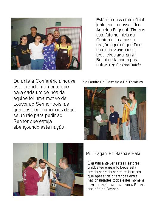 senhor. 12/06 Queridos Irmãos em Cristo, Primeiramente gostaria de louvar ao Senhor por cada um de vocês que estão orando pelo nosso ministério. Tenho trabalhado com uma das igrejas locais aqui na cidade de Sarajevo, a igreja a qual trabalho tem apriximadamente 60 membros, tenho tido um bom relacionamento com os membros da igreja, todos eles são muito amáveis conosco. Tenho me envolvido no minstério Jovem da igreja na area de discipulado, tem sido de grande benção ver os jovens da igreja querendo um compromisso sério com o Senhor. Claudia esta na mesma igreja que eu, mas ela esta no período inicial, que é o aprendizado da língua, ela ainda esta morando com a família mas, no mês de Julho ela já estará mudando para a minha casa e Gisele irá morar conosco também. Tenho ajudado o Travis (meu líder em Sarajevo) com os preparativos para a Conferência que teremos em Julho Ame os Balcãs esta é uma conferência voltada para o despertamento de missões para as igrejas locais. Tenh sido responsável juntamente com Sean na area de receber as inscrições para a conferência, tenho trabalhado também na área de divulgação do nosso ministério aqui na Bósnia. Realmente é muito bom poder estar fazendo algo relevante para este povo que necessita do amor de Jesus. Continuem orando pelo mover do Espírito Santo neste lugar. Queremos ver a união das 12 igrejas existentes aqui em Sarajevo e o fortalecimentos dos crentes aqui na Bósnia e Hercegovina. MOTIVOS DE INTERCESSÃO: · Pelas novas amizades; · Pelo trabalho com a igreja em Sarajevo; · Pela minha saúde física; · Emocional e espiritual; · Pelo meu sustento; · Pelo meu relacionamento com a equipe e · Pela conferência Ame os Balcãs MOTIVOS DE AGRADECIMENTOS: · Pelo apoio da minha família; ·Pela minha igreja mãe (I B Jd. das Industrias) · Pelas igrejas que me sustentam: I Ev. Livre SP, IBBarra do Embuí RJ e IP Jd. Satélite SJC · Pela liderança da OM Bósnia e OM Brasil. · Por cada um de vocês que tem se comprometido em oração com este ministério; ·E pelo meu desenvolvimento no aprendizado da língua