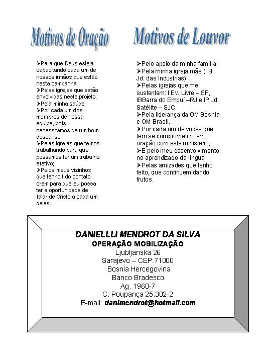 Pelas novas amizades; Pelo apoio da minha família; Pela minha igreja mãe (I B Jd. das Industrias) Pelas igrejas que me sustentam: I Ev. Livre SP, IBBarra do Embuí RJ e IP Jd. Satélite SJC Pela liderança da OM Bósnia e OM Brasil. Por cada um de vocês que tem se comprometido em oração com este ministério; E pelo meu desenvolvimento no aprendizado da língua. como fui abençoada quando cheguei aqui em Sarajevo. BANCO BRADESCO BANCO CAIXA EC. FEDERAL Queridos irmao !!! Me perdoem pelo tempo que nao escrevo para voces mas eh que mudei a semana passada em definitivo para Sarajevo e somente agora tive tempo para escrever para voces! Bom primeiramente quero pedir perdao por nao ter enviado ainda minha carta de oracao provavelmente estarei mandando mas para o final do mes. Quero agradecer o carinho de voces e as oracoes e dizer que fui abencoada por um lindo apartamente numa area residencial muito segura e trabalho com uma igreja batista aqui grande parte estou iniciando o trabalho aqui e posso dizer que estou realmente feliz em ver o que Deus tem feito ! Louvemos a Deus pois Claudia e Giseli estaram chegando a bosnia num previto de 2 semanas e isto eh resposta de oracao !! Amados passo a vcs o meu novo endereco Serah um prazer receber noticias de voces Fiquem na Paz, Danielli