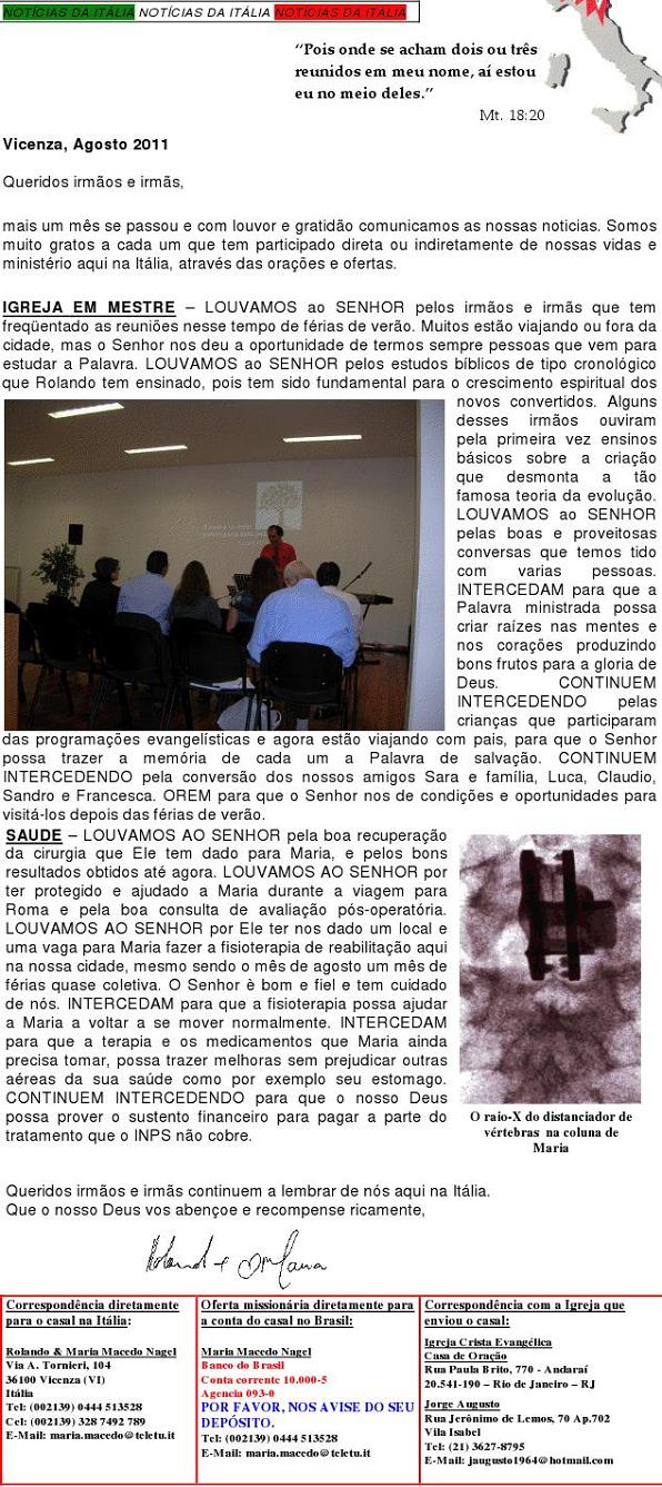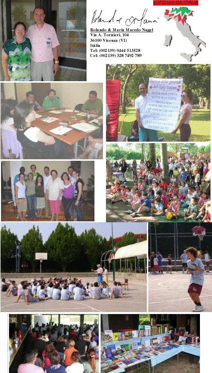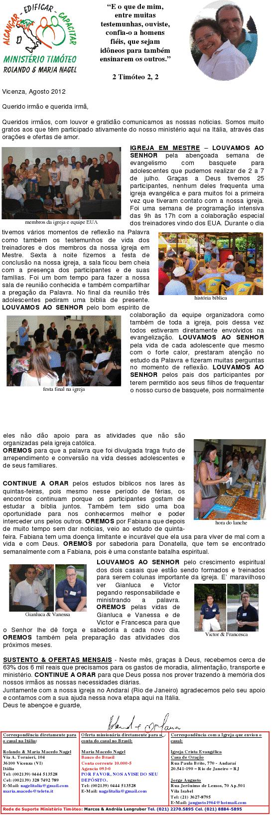 para o casal na Itália: Rolando & Maria Macedo Nagel Via A. Tornieri, 104 36100 Vicenza (VI) Itália Tel: (002139) _ 0444 513528 Cel: (002139) 328 7492 789 Oferta missionária diretamente para a conta do casal no Brasil: Maria Macedo Nagel Banco do Brasil Conta corrente 10.000-5 Agencia 093-0 POR FAVOR, NOS AVISE DO SEU DEPÓSITO. Tel: (002139)_ 0444 513528 Correspondência com a Igreja que enviou o casal: Igreja Crista Evangélica Casa de Oração Rua Paula Brito, 770 - Andaraí 20.541-190 – Rio de Janeiro – RJ Jorge Augusto Rua Jerônimo de Lemos, 70 Ap.702 Vila Isabel Tel: (21) 3627-8795 Rede de Suporte Ministério Timóteo_ Marcos Lengruber (0xx21) 2270.5895/ (0xx21) 8884-5895 |