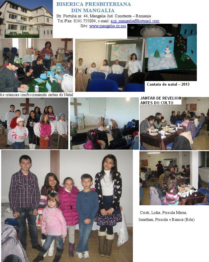 e também lápis, canetas, borrachas, réguas e lápis de cor. "Quem se compadece do pobre ao Senhor empresta, e este lhe paga o seu beneficio." Prov. 19:17 IGREJA PRESBITERIANA EM MANGALIA A Igreja do Senhor na cidade de Mangalia, trabalhou com toda a força no ano de 2006, realizando programações com jovens, criancas e mulheres. Jovens - Realizamos reuniões com jovens uma vez por mês, com muito louvor e a pregação da Palavra de Deus e recreação. Criancas - Temos semanalmente a E.B.D., e a cada 2 sábados por mês realizamos um Clube Bíblico (CB), onde tivemos uma boa participação. Realizamos uma peça teatral sobre o nascimento de Jesus. Crianças e jovens trabalharam juntos, e as mulheres da Igreja confeccionaram as roupas. Mulheres - Reunião de mulheres 3 vezes por mês com estudos Bíblicos e chás evangelísticos. Deus tem abençoado. Tivemos reunião de oração na Igreja às sextas-feiras, e aos domingos tivemos EBD e Culto à noite com toda a Igreja. Em cada Domingo tivemos uma participação muito boa, graças a Deus. Também no ano de 2006 recebemos com uma grande alegria um voluntário do Brasil que esteve conosco por um período de 3 meses, o nosso querido irmão Mário Devens, um jovem de 17 anos, de Aracruz, no Espírito Santo. Este foi um sonho realizado, termos um voluntário do Brasil. Também recebemos 32 voluntários de uma igreja da Inglaterra e 9 irmãos de outra igreja do País de Gales, os quais vieram ajudar a terminarmos a frente da nossa Igreja. Eles vieram, trabalharam e também trouxeram o dinheiro para a compra do material. A Igreja recebeu alguns presentes para crianças carentes, os quais foram usados como uma estratégia de evangelismo. O que mais podemos dizer é que “Até aqui o Senhor nos tem ajudado” Um grande abraço dos seus irmãos na Romênia. Mangalia, 16 de fevereiro de 2.007 Miss. Ireni, Cristi, Priscila e Lidia