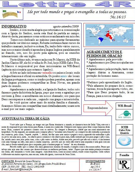 Obrigado pla resposta rapida. E um prazer tbe poder estar na vossa comunhão e podermos contar com as vossas orações e apoio. Nos estamos orando tb em vosso favor. Eu estou a estabelecer contactos em tdo o Mundo, porque precisamos tds uns dos outros, antes da vinda do Senhor Jesus. Bençãos abundantes...... Rév. Ramiro Manuel Ronald de Souza Teixeira _ 21/09/2009 Paz e Graça de nosso Senhor Jesus Cristo. Divulgação de nosso trabalho e pedido de oração. Irmãos de ministério, toda nossas vidas servimos a Deus na Igreja ICEB em Queirós-RJ, agora apoiamos (familia 4R : Ronald, Roberta, Rafaela, Raquel) a abertura da Igreja em Cabo Frio-RJ e estamos nos preparando por uma base de missões em Araruama. Envio uma carta (em anexo) e pedimos oração pois iniciaremos o pedido dos vistos. Estarei escrevendo mensalmente, e para mais detalhes ou tirar dúvidas, utilizem este e-mail. Fiquem na Paz do Mestre, que nos enviou. = = =