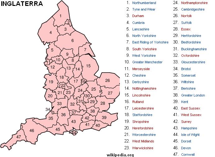 INGLATERRA - 22/02/2013 Atualmente a Inglaterra se divide em quatro níveis de subdivisões administrativas: regiões, condados, distritos e paróquias. Porém tradicionalmente, Inglaterra se divide em condados (shires), de constituição que tem sido algo variável. Os condados podem ser definidos para várias razões. Os condados cerimoniais são definidos pelo governo e a cada um é designado um Lord-Lieutenant. A maioria refere a um grupo de autoridades locais e frequentemente com referência geográfica. Os condados cerimoniais da Inglaterra. Northumberland Tyne and Wear Durham † Cumbria † Lancashire † North Yorkshire † East Riding of Yorkshire † South Yorkshire West Yorkshire Greater Manchester Merseyside Cheshire † Derbyshire † Nottinghamshire † Lincolnshire † Rutland Leicestershire † Staffordshire † Shropshire † Herefordshire Worcestershire West Midlands Warwickshire Northamptonshire Cambridgeshire † Norfolk Suffolk Essex † Hertfordshire Bedfordshire † Buckinghamshire † Oxfordshire Gloucestershire † Bristol Somerset † Wiltshire † Berkshire Grande Londres Kent † East Sussex † West Sussex Surrey Hampshire † Isle of Wight Dorset † Devon † Cornwall † LONDRES : www.uniaonet.com/euinglondres.htm MANSFIELD _ Nottinghamshire Neuza & Steve _ 23/7/04 www.uniaonet.com/euingmansfield.htm Wycombe YFC _ Noticias e pedido de oracao da MPC