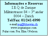 Rosengartenstrasse 1ª, 8037 Wipkingen, Zürich, Suiça. Dia 31.05.08 Culto de louvor, adoração e pregação da palavra de Deus, com a participação do Ministério Nações que Adoram (na Antiga sala do correio, a qual foi transformada em templo). Início às 19.30hs e com encerramento às 00 hora. Dia