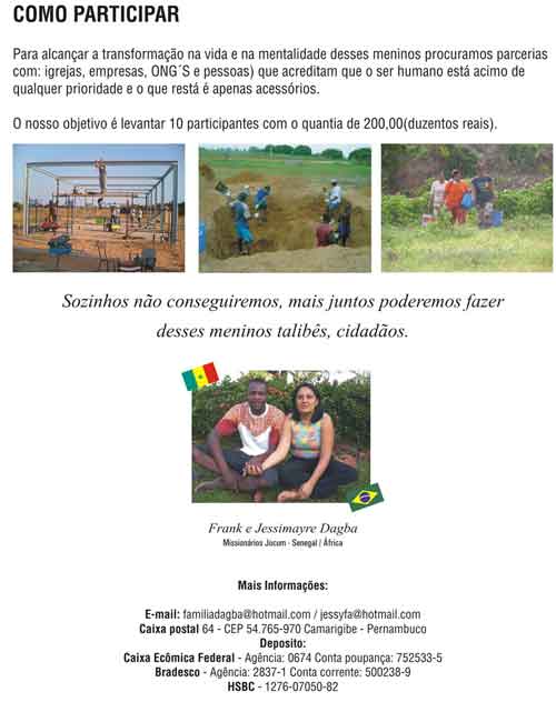 Escolhemos alguns amigos mais chegados pra compartilhar esse nosso desafio e queremos pedir que se voce se sente de alguma forma afrontada com essa nossa cartinha e com esse pedido, nos perdoe.Estamos quase incomunicaveis e quando comunicamos temos mais um desafio.Sao os imprevistos da nossa vida cheia de desafio e vitorias. Mas estamos com um desafio e temos sido afetados ministerialmente e financeiramente por isso , oramos a Deus e sabemos que esse é o tempo pra compartilharmo, queremos que cada um de voces orem e perguntem a Deus sobre isso. QUeremos compartilhar com voces um grande motivo de oração e ação.Nos estamos sem computador a mais de oito meses , o nosso um lap top toshiba satelite, queimou a placa mae e nao estamos com condiçoes de concerta-lo, e nossa comunicação ta toda atrasada, os nossos parceiros tem nos cobrado , mas pra minha esposa é complicado fazer a comunicacao fora da nossa casa e da base , devido os cuidados com as bebes e a menorzinha Sara ainda mama.Todas as despesas desse equipamento custa1.000,,00 em media e precisamos das oracoes e da ação dos santos pra vencer mais essa batalha.Esse equipamento é ideal pra levarmos pra africa , pelo tamanho e a marca pois foi fabricado pra suportar altas temperaturas. Aguardamos seu retorno e qualquer deposito devera ser feito na conta poupança do Bradesco. - - -