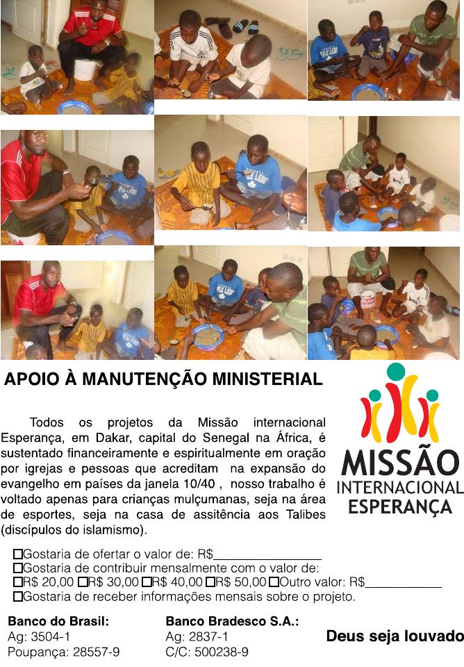MOTIVOS DE ORACAO o nosso obreiro Jean Vitorio, ta com tudo pronto pra fazer uma formacao no Brasil, ele orou durante um tmepo e Deus abriu as portas todos os papeis tao prontos, falta so o valor de R$ 3.500,00 reias pra que ele consiga o visto e compre as passagens se voce quer ajuda lo entre em contato conosco.Vitorio e africano e precisa de um treinamento e chamado por Deus pro ministerio, e obediente e fiel, mas como africano e imposssivel pra ele e pra como sua lideranca alcancar esse valor em dinheiro . voce pode participar com o que Deus colocar no seu coracao, e por favor orem por ele. Nossa casa precisa de um congelador horizontal no valor de R$ 1.200,00 , a familia tem crescido . Mes de maio e puxado, precisamos pagar dois meses da