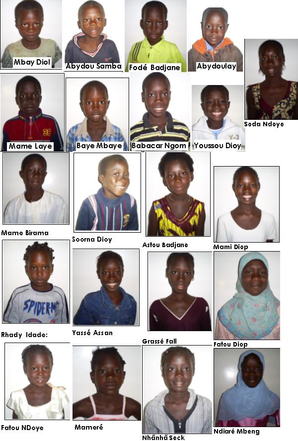 Idade: 7 anos Etnia: Lebu Pai tem uma só esposa Fatou NDoye Idade: 7 anos Etnia: Lebu Pai tem 2 esposas ela é filha da segunda. Soorna Dioy Idade: 7 anos Etnia: Lebu Filha mãe solteira Yassé Assan Idade: 10 anos Etnia: Wolof. Pai tem uma única esposa. Mameré Idade: 09 anos Etnia: Lebu Órfã de pai. Astou Badjane Idade: 9 anos Etnia: Wolof Pai tem 2 esposas, ele é filho da segunda esposa. Grassé Fall Idade: 10 anos Etnia: Lebu Pai tem 2 esposas, ela é filha da segunda. Nhãnhã Seck Idade: 12 anos Etnia: Lebu Pai tem 4 esposas, ela é filha da quarta. Mami Diop Idade: 12 anos Etnia: Lebu Pai tem uma única esposa. Fatou
