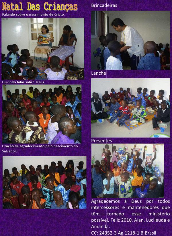 a paz e a graça de nosso Senhor Jesus Cristo, Estou enviando em anexo uma foto de cada uma das nossas crianças do Projeto de Alfabetização e Princípios, esse projeto tem sido benção nas nossas vidas, mas tem sido muito difícil sustentá-lo devido ao alto custo de vida aqui no Senegal por isso estamos escrevendo porque queremos continuar esse trabalho e contamos com apoio de cada um de vocês Caso você se interesse em apadrinhar uma delas com valor de R$ 20,00 reais mensais, entre em contato conosco ou efetue diretamente seu depósito em nome de: Domingos Alan Medeiros Morais. Banco do Brasil. CC: 24352-3 Ag. 1218-1 Um forte abraço em Cristo, Lucileuda Marques. E