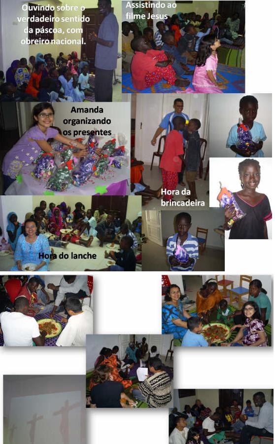- - Amados irmãos a graça e paz de nosso Senhor Jesus Cristo estejam sobre vossas vidas!!!!!! "Ele não está aqui, mas ressuscitou." Luc. 28:6 Quando estamos em países com liberdade religiosa como o Brasil datas comemorativas como Natal e Páscoa, se tornam somente tradição para nos reunirmos com amigos e família, geralmente no Natal esquecemos o aniversariante (Jesus) e na Páscoa os ovos e coelhos tomam o lugar da morte e ressurreição do Senhor; porém quando estamos em países onde o islamismo predomina, essas datas são comemoradas de maneira mais fervorosa é hora de mostrar nossa fé e o que realmente estamos festejando, é um momento precioso para falar de Cristo e sua obra redentora sobre a terra, falar da cruz erguida no calvário e o valioso sangue derramado, da ressurreição real, que Ele realmente venceu a morte, agora temos livre acesso ao Trono de Deus e podemos clamar Aba Pai. Aleluia. O parágrafo acima cita nossa trajetória no mês de abril, preparamos tudo para festejar a páscoa com os nacionais, aproveitamos essa oportunidade, já que estamos em um lugar fechado para o Evangelho. Para as pessoas que participam da reunião de oração em nossa casa foi apresentado o filme Jesus de Mel Gibson, as pessoas ficaram tocadas por verem o sofrimento real de Cristo, elas nunca tinham visto a realidade e muitas choraram por ver o sofrimento do Senhor, após apresentação do filme, foi ministrado uma palavra sobre morte e ressurreição, uma oração foi feita e foi servido um delicioso prato senegalês à base de frango. As crianças do Projeto de Alfabetização também tiveram sua comemoração, foi-lhes ministrada uma palavra do porque nós comemorávamos a páscoa, após a palavra, fizemos brincadeiras, servimos um lanche e distribuímos lembrancinhas, realmente foi um momento muito feliz, principalmente, para 4 dos nossos alunos que perderam o pai neste mês, foi muito bom vê-los brincando e se alegrando após ouvir a Palavra de Deus. Nós estamos com grande sonho e também um grande desafio, a casa vizinha a nossa está para alugar e nela vemos a oportunidade de começar nosso centro de alfabetização, seria maravilhoso porque não teríamos vizinhos muçulmanos para dificultar nosso trabalho e poderíamos expandir nosso projeto, até mesmo aumentar o número de crianças. A maior dificuldade para realização desse sonho é que aqui aluguel é muito caro, e isso nos custará cerca de R$ 625,00 (seiscentos vinte cinco reais), mais calção e 1 mês de avanço, para nós é IMPOSSÍVEL, pois temos dificuldade até mesmo com nosso sustento pessoal, porém sabemos que para Deus nada é IMPOSSÍVEL, temos o desejo enorme de abençoar este povo, por isso contamos com você para realização desse sonho. Motivos de oração Para que o Senhor levante alguém para sustentar financeiramente o aluguel da casa citada acima; Por salvação neste lugar; Por nossa saúde e sustento financeiro; Por nossos familiares no Brasil. No amor d’Aquele que morreu para salvar as nações, Alan,Lucileuda e Amanda. 4 de maio de 2009 - intercessão : Amados irmãos a paz do Senhor. Estamos escrevendo para pedir oração porque aqui em Yoff, está sendo realizado o Ndepo, ou seja, um ritual realizado em homenagem ao espírito adorado aqui no local a potestade dos mares (Mamme Ndieré), hoje mesmo, 04 de abril foi sacrificado um boi , e pessoas em plena luz do dia caem endemoniadas, uma atrás das outras, é uma manifestação terrível de se ver, muitas pessoas endemoniadas ao mesmo tempo, esse ritual se repetirá por 8 dias, um dos pontos de concentração deles é na nossa rua. Dezenas de pessoas estão no local para assistirem a manifestação inclusive crianças. Quando vemos algo como esse ritual lembramos do versículo que o Senhor nos deu logo quando chegamos aqui: Não obstante, é um povo roubado e saqueado; todos estão enlaçados em cavernas e escondidos em cárceres; Quem há entre vós que ouça isto? Que atenda e ouça o que há de ser depois? Is. 42:22-23 Creio que cada um de nós salvos pelo Senhor nos importamos , e ouvimos o clamor desse povo, por isso conto com suas orações pelo povo lebu, que realmente estão encarcerados há muito tempo. Amados que o Senhor intervenha diretamente nessa situação levando essas pessoas a Cristo o Senhor, estamos aqui e queremos muito que vidas sejam salvas atrás da Palavra de Deus. Ore por este povo e por nós neste momento. No amor d'Aquele que morreu para salvar as nações, Alan, Lucileuda e Amanda. Amados irmãos a paz do Senhor esteja convosco. Fizemos um blog com um resumo do nosso ministério e gostaríamos muito de receber a visita de cada um, deixe seus comentários o que gostaram e também o que não gostaram para estarmos melhorando. Um forte abraço em Cristo. Alan, Lucileuda e Amanda. = = = “Disse