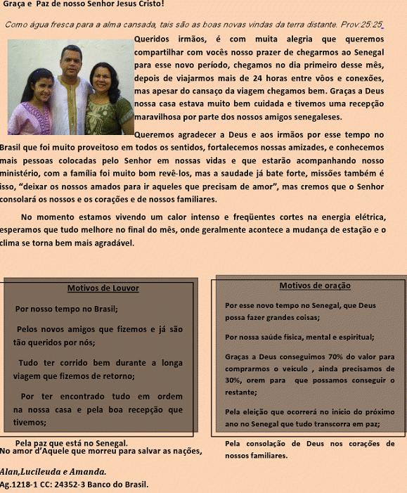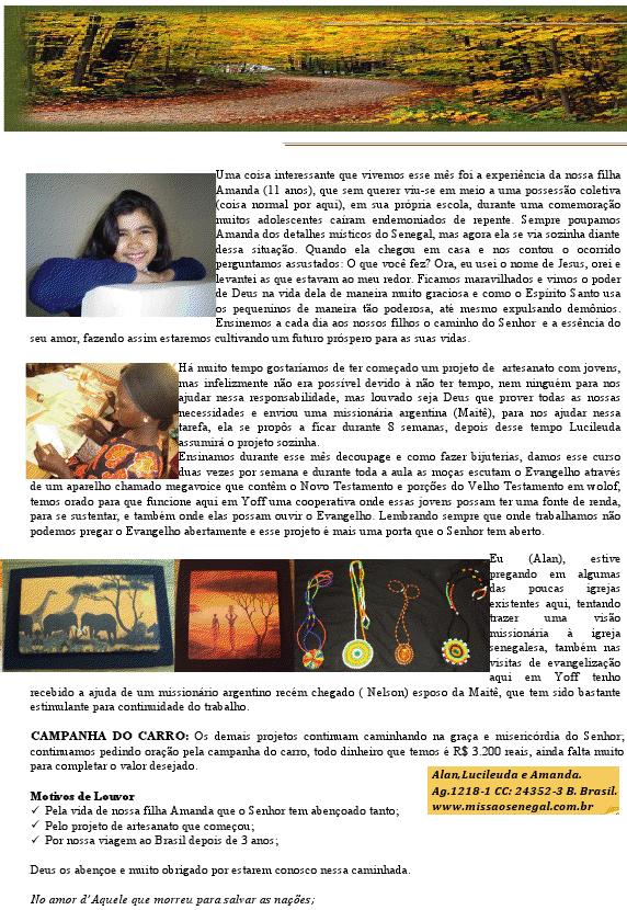 irmãos a paz do Senhor, Estou enviando o nosso informativo aqui do Senegal onde trabalhamos em meio ao povo lebu,que é um povo não-alcançado e não aceita nem mesmo fundação de igrejas em meio deles. Agradeço desde já a disponibilidade de vocês em trabalhar com a obra missionária, já que nós missionários sempre precisamos daqueles que segurem as cordas enquanto descemos a parte mais profunda do poço. Que Deus em Cristo vos abençõe. No amor d'Aquele que morreu para salvar as nações, Lucileuda Marques. =