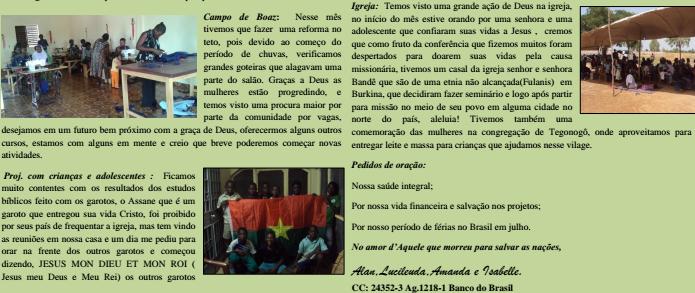 entre os povos, relembrai que é excelso o seu Nome. Is.12:3-4 Projeto Campo de Boaz: Quando olhamos para esse projeto o nosso coração se alegra pois vemos o impossível de Deus acontecendo, somente Ele poderia nos dar tamanha benção como instrumento para o trabalho missionário, sabemos que com o tempo os resultados na vida das pessoas serão positivos e veremos a mão do Senhor restaurando os seus corações e transformando as suas vidas, pois o Senhor começou a boa obra Ele a concluirá. As mulheres estão bem interessadas em aprender e já começam à esboçar algumas coisas. Agradecemos aqueles que têm se mostrado fiéis em orações e ofertas, saiba que o seu esforço tem mantido esse projeto funcionando, obrigado por se unir à nós nessa empreitada de abençoar vidas em Burkina Faso. Génération Plus: Louvamos a Deus porque Assane o menino do grupo que se converteu continua firme em Cristo, ele tem ido à igreja aos domingos e tem sido assíduo na reunião de quarta-feira, onde compartilho o Evangelho e tiro as suas d?vidas entre cristianismo e islamismo, a grande maioria dos meninos do futebol são muçulmanos. Oremos para que a Palavra permaneça nos corações e multiplique-se abundantemente. Igreja: A II Conferência Mmissionária foi uma grande benção, tivemos dois dias de programação apesar do calor de 45 graus os irmãos compareceram, tivemos a presença de missionários que deram seu testemunho, encorajamos os nacionais a ganharem Burkina Faso para o Senhor Jesus, vimos o mover de Deus e isso como sempre é o mais gratificante.