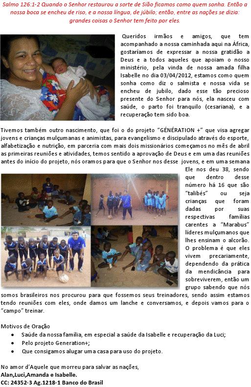 Burquina : www.facebook.com/photo.php?fbid=563959943627130 Agradecemos a Deus por sua fidelidade, pois nos bons e maus momentos provamos a sua graça em nossas vidas, aqui muitas vezes corremos com aqueles que vão a pé, e outras com aqueles que vão a cavalos, desafios imensos que temos que fazer face, e quando achamos que não vamos conseguir, que não existem meios para suprir, o socorro do Senhor aparece, no tempo dEle. O cansaço existe por vários fatores, seja climático (50 graus ultimamente), seja emocional, mental, financeiro, entretanto o nosso Deus faz forte o cansado e multiplica a força ao que não tem mais vigor, sendo assim tributamos louvor e gratidão ao Deus que está conosco em qualquer corrida. Campo de Boaz: Nesse mês tivemos que fazer uma reforma no teto, pois devido ao começo do período de chuvas, verificamos grandes goteiras que alagavam uma parte do salão. Graças a Deus as mulheres estão progredindo, e temos visto uma procura maior por parte da comunidade por vagas, desejamos em um futuro bem próximo com a graça de Deus, oferecermos alguns outros cursos, estamos com alguns em mente e creio que breve poderemos começar novas atividades. Proj. com crianças e adolescentes : Ficamos muito contentes com os resultados dos estudos bíblicos feito com os garotos, o Assane que é um garoto que entregou sua vida Cristo, foi proibido por seus país de frequentar a igreja, mas tem vindo as reuniões em nossa casa e um dia me pediu para orar na frente dos outros garotos e começou dizendo, JESUS MON DIEU ET MON ROI ( Jesus meu Deus e Meu Rei) os outros garotos mulçumanos ficaram impactados ouvindo ele fazer essa oração, o Senhor tem trabalhado na vida desses garotos e já temos visto frutos no presente. Igreja: Temos visto uma grande ação de Deus na igreja, no início do mês estive orando por uma senhora e uma adolescente que confiaram suas vidas a Jesus , cremos que como fruto da conferência que fizemos muitos foram despertados para doarem suas vidas pela causa missionária, tivemos um casal da igreja senhor e senhora Bandê que são de uma etnia não alcançada(Fulanis) em Burkina, que decidiram fazer seminário e logo após partir para missão no meio de seu povo em alguma cidade no norte do país, aleluia! Tivemos também uma comemoração das mulheres na congregação de Tegonogô, onde aproveitamos para entregar leite e massa para crianças que ajudamos nesse vilage. Pedidos de oração: Nossa saúde integral; Por nossa vida financeira e salvação nos projetos; Por nosso período de férias no Brasil em julho. No amor d’Aquele que morreu para salvar as nações, Alan,Lucileuda,Amanda e Isabelle. Amamos o povo africano e temos como casal nos dedicado a esse povo por 10 anos, temos caminhado nas veredas africanas felizes por estar na vontade de Deus; porém, há algum tempo ouvimos a voz do Espírito dizendo que o nosso tempo de África estaria terminando, ficamos em oração e pensando: Qual novo caminho terá o Senhor para nós. E como os caminhos do Senhor não são os nossos (Is. 55:8), Ele nos direcionou para um outro campo, uma terra que mana leite e mel, mas povoada de gigantes , gigantes como o ateísmo, o ocultismo, a decadência do cristianismo, a ascensão do islã, etc. Sim o Senhor está nos levando para a Europa, especificamente para França, onde Ele abriu portas para estarmos trabalhando com uma escola de línguas e também trabalhando junto com a Igreja local, hoje a França consta com cerca de 200 igrejas sem pastor, mais uma vez essa realidade nos faz lembrar de Jesus quando se comoveu da multidão, pois eram como ovelhas que não tinham pastor. Estamos indo debaixo da benção de Deus e também da nossa liderança e parceiros no Brasil, que após orarem e conversarem conosco entenderam que o nosso tempo em Burkina Faso estava terminando, os nossos projetos ficarão no encargo da igreja local que sempre trabalhamos. Saímos da África, mas com certeza ela não saíra de nós, jamais esqueceremos o que vivemos nas nações que passamos, das pessoas que convivemos, desse povo que apesar das grandes adversidades que passam canta e dança na presença do Senhor, um povo que nos acolheu e nos ensinou a chorar com eles e por eles, jamais esqueceremos das lutas travadas, nem das vitórias conquistadas nesse lugar. Continuamos contando com as orações e o apoio de cada um de vocês nesse novo desafio, estejam conosco precisamos de vocês. Segue abaixo fotos do nosso culto de despedida, onde recebemos a oração e bênção da igreja de Burkina, foi um momento de muita emoção e gratidão ao Senhor. www.uniaonet.com/europafranca.htm www.facebook.com/lucileuda.marques _ Alan , Lucileuda, Amanda e Isabelle Como
