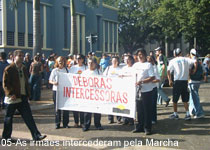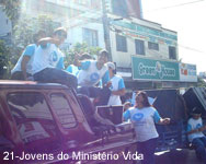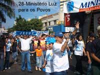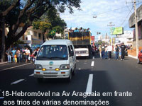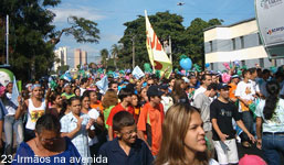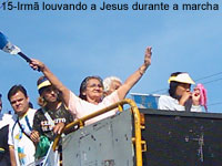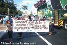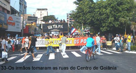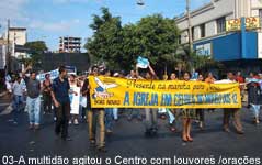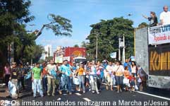 Marcha Para Jesus mobiliza multidão em Goiânia . Milhares de irmãos em Cristo estiveram lotando as ruas do centro de Goiânia nesse dia 18 de junho de 2005. Um evento consagrado e que a cada ano conta com um número maior de denominações e outro mais expressivo de evangélicos, demonstrando o crescimento na quantidade e qualidade de fiéis. Haviam trios elétricos de vários tamanhos, mas todos indistintamente tocavam louvores, proclamavam a Vitória de Jesus e faziam orações. Senhoras Intercessoras oravam pelo trajeto, levando emoção aos transeuntes de qualquer das outras religiões. Os jovens eram a maioria e faziam a animação contagiar a todos, inclusive aqueles que das janelas dos prédios ou mesmo na porta dos comércios recebiam as palavras de fé e evangelismo. Jovens confirmavam a unção alegre de se servir a Jesus. O percurso teve início na Praça Cívica, desceu a Av Araguaia, cruzou a rua 4, subiu a Av Tocantins e encerrou na Praça Cívica. Ocasião em que foi feita oração e os oradores, obreiros da organização e autoridades falaram aos irmãos a satisfação e o êxito que foi a Marcha Para Jesus 2005. (JCB) .