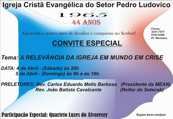 de famílias.www.projetoamor.com _ Informativo Gospel Canal de convergência dos evangélicos brasileiros . . .Vital Sousa . . . Edição de 26/03/2009 - Ano II - no.97 . . . Aconselhamento Pastoral na Depresão Infantil Contribuição de um Psicólogo para o AP na Depressão Infantil. . . . Fora com as palhaçadas ministeriais J. Lee Grady, editor da revista Charisma . . . Fazendo missões no Paraguai! 15a. Caravana do Pr. Messias Lopes! . . . http://vigilantedafe.wordpress.com _ VEJAM E COMPAREM. NOVO COMENTÁRIO DE VIGILANTE DA FÉ. www.umceb.com.br . . . MARÇO 2009 - Dia 01 – Culto