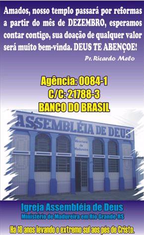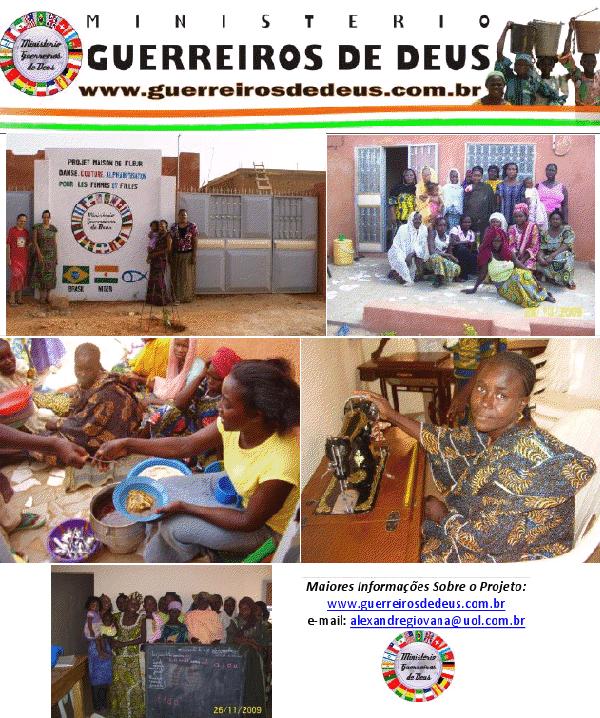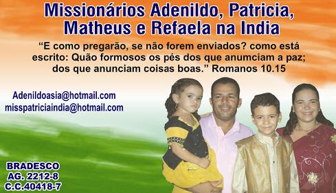 . MARANHÃO 4º Projeto Rally da Misericórdia De 10 a 25 de Julho de 2010. . . ( Santa Filomena –PI e Tasso Fragoso –MA , pois, segundo pesquisas realizadas pela SEPAL estes dois municípios estão na área dos menos evangelizados e carentes dos dois estados. . . treinamento ( 26 a 27 de março de 2010). Telefone (61) 81313531 .. . . rallydamisericordia@hotmail.com . . OBS: Em janeiro de 2010 estaremos em visita ao campo ( Santa Filomena-PI e Tasso Fragoso-MA ) para reconhecimento, pesquisas, comunhão e reunião com a liderança local . Solicitamos dos amados que orem pela nossa viagem de 14 a 25 de janeiro de 2010 Ministério Vidas em Ação Projeto Rally da Misericórdia Pr sergio Rezende e Pra Maira Rocha Rezende . MINAS GERAIS www.missaovolantesdecristo.com próximos projetos: QUELUZITO - MG - de 10 a 22 de janeiro de 2010 Queluzito é uma cidade não alcançada com cerca de 3.000 habitantes, em Minas Gerais, próxima a Conselheiro Lafaiete e Barbacena. O objetivo do PROJETO RELUZ QUELUZITO é a implantação de uma igreja evangélica. Como participar: 1 - Você pode divulgar para seus contatos. 2 - Você pode orar pelo sucesso do projeto 3 - Você pode ofertar para ajudar no sustento do projeto. 4 - Você pode ir evangelizar conosco no projeto. Valor do Investimento: R$ 220,00 ( duzentos e vinte reais) . . . www.bhcentro.ywambrazil.org Abertas as inscrições para mais um Projeto Radical Latino 2010 www.uniaonet.com/afmocdondoerlon.htm . . . Por favor continue orando para o Gabriel para que ele contiue se recuperando rapido . No braço como a queimadura foi no meio do braço e ele não esta movimentando muito o braço e a enfermeira que esta fazendo o curativo nos falou que precisávamos tentar ajuda-lo a mover o braço para que ele não necessite fazer fisioterapia depois. Continuaremos mantendo voce informado de como esta o Gabriel . um grande abraço . Familia Freitas. http://olizaniaisrael.blogspot.com Sou missionária em Entre Rios de Minas, MG. Sou membro e fundadora da Igreja Evangélica Batista do Ministério Internacional de Evangelização. Estou trabalhando na divulgação do meu primeiro CD, com intuito de arrecadar fundos para sustentar O ministério. Nós trabalhamos evangelizando através da música ( ensinando violão, teclado, piano, teoria musical etc, gratuitamente) . . . Ensinamos Inglês e Espanhol gratuitamente, (usamos metodologia do curso CCAA). Esse curso é voltado para pessoas que têm chamado para missão, Então eles se preparam pela fé. Iniciamos um turma com 40 participantes, de várias denominações. Eu não sei quem o Senhor vai usar, mas sei que elas estão prontas para falar inglês e espanhol, mais uma arma de guerra. . . . Sou estudante de Inglês e Espanhol e desejo partir em breve em alguma direção fora do Brasil em nome de Jesus. Porque eu creio que tenho um chamado de Deus em minha vida. Aguardo resposta!