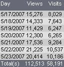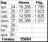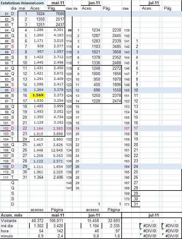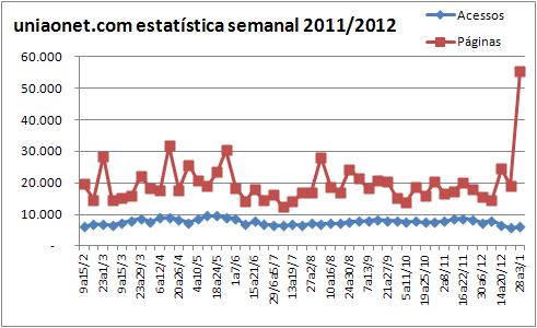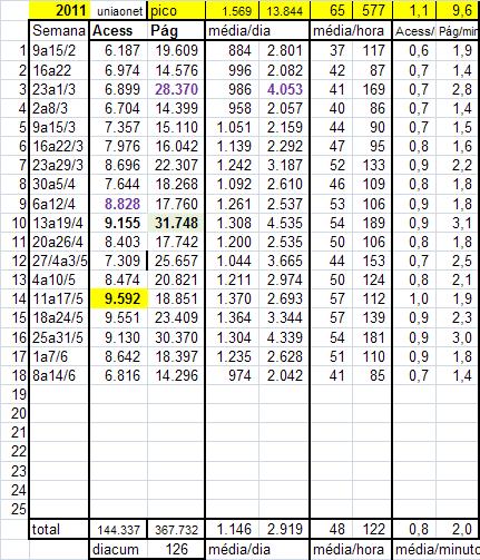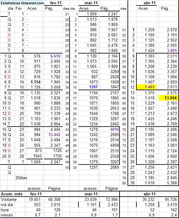 uniaonet.com : maiores índices: 1.461 Acessos/dia = 61/hr, 1/min , ( a cada minuto uma pessoa acessou o uniaonet.com em 12/04/2011 ) . 13.844 pág/dia = 577/hr, 9,6/min ( a cada 6,25segundos uma página foi acessada em 14/04/2011 .