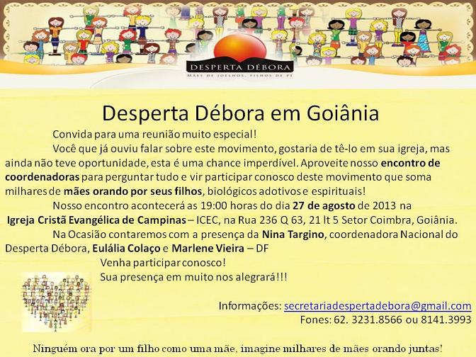 Segue em anexo um folder com a nossa programação. = = = Convido a todos para uma reunião na sexta-feira próxima, dia 27, às 09:00 horas (da manhã), no anexo II da Igreja Cristã Evangélica de Campinas. Fundo do Bradesco da Praça "A". Queremos conversar com todos sobre a decisão do Supremo tomada recentemente e como mostrar nossa posição para os Parlamentares que terão uma grande responsabilidade na próxima semana. Traga suas idéias e vamos juntos pensar numa forma de impactar nossas autoridades. Temos algumas diferenças, mas todos nós somos unânimes neste assunto. Vamos fazer valer nossa influência. Um grande abraço a todos, Luis Valter Costa FreitasAté que todos ouçam! (62) 9628-1069(62) 9321-9913 (62) 3434-7724 Pr. Marcos José twitter.com/PrMarcosICEC = = = A igreja Cristã Evangélica de Campinas fica na Rua 234 C/236 Nº 372, Setor Coimbra - Goiânia_ Goiás. Maiores informações: (62)3531-1000 ou (62)3531-1001 Marta Borges _ 4 de julho de 2011 _ Queridos irmãos da ICEB, apesar de não estar na ICEB atualmente, e sim na IPB, continuo com vínculos muito fortes na Igreja Cristã, minha Igreja do coração. Hoje estive em Goiânia, pois faleceu uma grande e muito querida amiga, Gilda Soares Faria, da Igreja Cristã Evangélica de Campinas ICEC. Ela estava doente há 7 meses, com um câncer no cérebro, depois de vários tratamentos, e reincidência do tumor, ela não resistiu e faleceu ontem a noite, 03/07/2011. Agradecemos a Deus por sua vida, seu testemunho, sua confiança no Senhor e cremos que agora ela está curada pois está na glória, com o Senhor. "Preciosa é, aos olhos do Senhor, a morte dos seus santos". Sl 116:15. Abraços a todos Marta de Souza Borges = = = Madalena Ferrante - Não me lembro quem era.... mas é triste saber. Bjus - - - .Geracina - Ela fazia parte de um grupo de quarteto feminino? - - - Marta Borges - Sim. Quando bem jovem, ela cantava no Conjunto Pedrinhas Brancas, era a loira de olhos azuis. - - - Geracina - Nossa, me lembro dela sim, ms moro aqui em Goiania, e ñ sabia disso... - - - Madalena - Agora que a Marta Borges citou o fato acima, lembrei dela sim.... Ela não casou com um jovem da Cristã de Goiânia, era médico, acho que seu nome era Eduardo ? - - - Marta Borges- Essa é a prima dela, a Milza. A Gilda era a loira do conjunto. - - - Madalena - ah....é faz muito tempo. O Joel também não é parente delas - - - Samuel Pereira - Meus sentimentos. Me lembro da Gilda. O consolo de Deus para a família. = = = http://icec.org.br _ Culto de Gratidão pelos 1300 Programas Através da Bíblia _ dia 15/10/2011 na Ig Cristã Evag em Goiânia _ Rua 234 , nr.373 S.Coimbra (Via_ Pr. Ezequiel/SIBGyn) - - - Roxana Bustos Morales e Messias Cruz _ curtiram isso. Desperta Débora ... culto aqui em Goiânia no próximo dia 27/08/2013 , na Ig Cristã Evang de Campinas , R236 , Q63 . L15 ( Próx á Pç A ) ás 19hr q, ueremos destacar a presença mais que especial da nossa coordenadora nacional: Nina Targino, que na ocasião nos trará uma palavra. Contamos com sua presença e com a presença dos seus convidados! , Adriana Rosa Coordenadora |