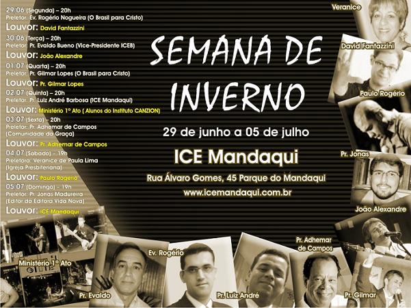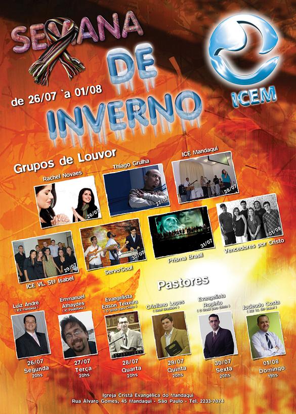 Mensagem: Pr. Sérgio Paulo M. Figueiredo – ICEM Louvor: Ministério Verdadeira adoração – S.J. dos Campos 14/07 – Sexta-feira – 20h Mensagem: Pr. Joel Stevanato – Igreja “O Brasil para Cristo” Louvor: Ministério O Brasil para Cristo - Mandaqui 15/07 – Sábado – 20h Mensagem: Pr. Sérgio Marcos dos Santos – Ministério Cristo Vive Louvor: Conjuntos da ICEM 16/07 – Domingo – 19h Mensagem: Pr. Jucieudo B. da Costa – ICE Sta. Izabel – SP Louvor: Ministério Paulo Rogério Teremos cantina