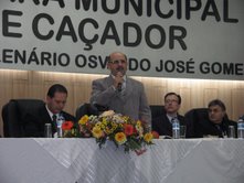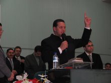 Aconteceu no dia 10 de março no templo central da IEAD Caçador o culto de despedida do pastor Sérgio Melfior e a posse do pastor Cláudio Caetano... O templo ficou completamente lotado, cerca de 1 mil irmãos. Presentes o presidente a CIADESCP, Pr. Arcelino de Melo, pastores presidentes de cidades vizinhas, obreiros e uma caravana, cerca de 40 irmãos, vinda de Joinville para acompanhar o pastor Cláudio. O dueto Amilton e Marlene de Joinville adoraram ao Senhor com o hino "passo a passo", que enaltece a recompensa e o galardão do cristão comprometido com a Obra de Deus. O pastor Lionel dos Santos, presidente do conselho da 12ª região da CIADESCP, deixou sua palavra ao pastor Melfior, “incentivei os irmãos de Fraiburgo para vir aqui para prestigiar o servo de Deus, amamos o pastor Sérgio, desejamos ao senhor muitas bênçãos, muito sucesso e muita sabedoria de Deus para que o acompanhe em Joinville, somos amigos desde a adolescência e estamos fazendo juntos a obra do Senhor”, salientou. O pastor Lionel também deu boas vindas ao pastor Cláudio Caetano que assume a IEAD de Caçador, e deixou aos presentes os textos, Gn 6.22; 7.5, “o pastor e o ministério local deve fazer de acordo como Deus ordenar, não existe ministério grande, pequeno, Deus ordenou, faça para a Sua glória. Noé fez exatamente como Deus ordenou, por isso deu tudo certo”, finalizou. O presidente da CIADESCP e de Honra da IEADJO, pastor Arcelino de Melo, agradeceu a Deus pela vida do pastor Sérgio, “tiramos o pastor Sérgio para o trabalho e acompanhamos o trabalho, o ministério que Deus colocou em suas mãos, oramos para que Deus dirigisse todas as coisas. Quando jubilamos em Joinville, oramos a Deus e o pastor Sérgio assumiu mediante o conselho de pastores da junta executiva de nossa convenção”, disse. Quanto ao pastor Cláudio Caetano, o pastor Arcelino disse, “o pastor Cláudio é um homem de Deus que trabalhou comigo catorze anos, família abençoada, grande pregador com graça de Deus, administrador com graça de Deus”, salientou o presidente. A esposa do pastor Melfior, irmã Maria Helena, leu Ec 3.1, e agradeceu as orações e carinho da Igreja Caçadorense a família do pastor, “agradeço a Deus por ter passado por aqui, o que marcou a nossa vida em Caçador, foi o acidente que sucedeu, mas juntos oramos ao Senhor com a Igreja e Deus ouviu as nossas orações. Aqui perdemos um grande companheiro de meu esposo, mas sabemos que Deus dá a vida e também recolhe seus filhos. Mas aqui em Caçador o Eliseu concluiu sua faculdade, e casou-se, portanto ganhamos uma filha aqui em Caçador. (...) Agradeço a Deus pelo seu amor e cuidado, a Ele honra, louvor e glória para sempre”, disse a irmã Maria Helena, que também agradeceu os departamentos e seus responsáveis pelo apoio ao ministério pastoral. O pastor Sérgio Melfior agradeceu aos departamentos pelo envolvimento com a Obra de Deus, citou cada coordenador e equipe de trabalho, enfatizou os esforços de cada um e emocionou a Igreja presente com lágrimas louvou a Deus pelo grande trabalho realizado na cidade de Caçador. A Igreja acompanhou um vídeo que apresentou com fotos a vida e o ministério do pastor Sérgio Melfior, os cidades por onde passou, a excelente administração exercida em Fraiburgo e Caçador que o projetou para trabalhar com a aprovação de Deus na maior cidade de Santa Catarina, Joinville. Os departamentos da IEAD Caçador prestaram sua homenagem ao pastor Sérgio, bem como a presidente da Câmara Municipal de Vereadores de Caçador, Sirley de Fátima Tibes Ceccatto, representada pelo vereador Jorge Antonio Savi, que entregaram um certificado de homenagem e agradecimento. Acompanham o pastor Sérgio Melfior para Joinville os obreiros: Pr. Daniel Melo; Pb Joary Carlesso; Pr. David Barbosa; Pr. Zelino José Manoel da Silva; Pr. Kleber da Silveira; Ev Amarildo Feler; Ev João Rosa; Ev Laércio Fernandes; Pb Adriano Maurício Bento; Pb Natanael Santos; Pb Luiz Schmidt e Pr. Davi de Menezes. O pastor Cláudio Caetano louvou a Deus pela vida do pastor Arcelino de Melo, pela confiança em sua pessoa e no ministério, pela liberdade de trabalhar na Obra do Mestre. Para ver as fotos em alta resolução, https://picasaweb.google.com/ieadjoinvillesc - - - Pr. Joary Jossué Carlesso Agora mudando de Caçador para Joinville - SC Igreja Evangélica Assembléia de Deus Departamento de Comunicação (47) 3431-4300 Pr_Márcio Batista Diretor DepCom logoieadjo.jpg - - -
