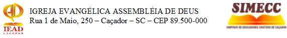 Att. Pr. Joary Carlesso Coordenador Dep. Discipulado IEAD Joinvile - SC - - - IGREJA EVANGÉLICA ASSEMBLÉIA DE DEUS Rua 1 de Maio, 250 – Caçador – SC – CEP 89.500-000 Caçador,