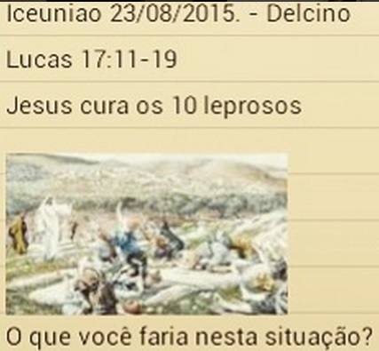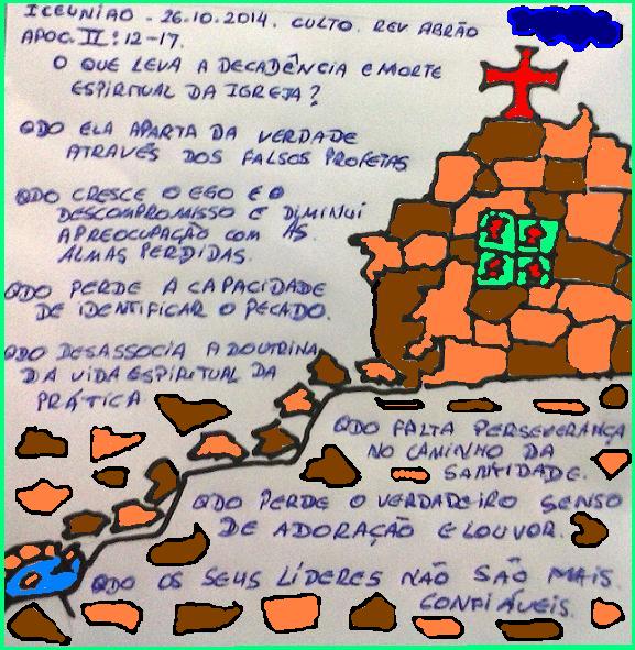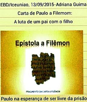 www.uniaonet.com/iceuniao.htm - Escola Bíblica DOminical da Ig Cristã Evang União, 13/09/2015-Adriana Guima Carta de Paulo a Filemom: A luta de um pai com o filho Paulo na esperança de ser livre da prisão Qual é a nossa prisão? Quem está conosco em nossa prisão? (Onde Deus está é luz) Paulo estava preso com Onésimo, escravo q fugiu de Filemom, e estava sentenciado à morte. (Qtos d nossos jovens estão condenados a morte? Mas onde eles estiverem podem encontrar um "Paulo" para interceder por eles) Paulo manda Onésimo de volta a Filemom com esta carta nas mãos , pedindo não só o perdão mas também a permissão para ele ficar com o próprio Paulo . Filemom filho na fé de Paulo vai encontrar não mais o seu escravo, mas o também filho na fé de Paulo gerado em cadeias. Agora eles são irmãos! Nós não podemos parar de ter filhos (na fé) apesar de nossas prisões e das sentenças de morte. www.facebook.com/photo.php?fbid=557204114302713 Culto/Iceuniao, 13/09/2015: Salmos42 Onde està o seu Deus??? Se não soubermos responder esta pergunta, podemos entrar em depressão ,perder a esperança por não saber qdo Deus vai agir e começar a murmurar. ![]() Iceuniao-EBD 20/9/15 - Adriana Abe - ICor.10: Não pratiquemos imoralidade, idolatria, murmuração... Tudo é lícito mas nem tudo convém, fazei tudo para a glória de Deus. - - ![]() Culto : Davi estava com ódio devido a deportação para Babilônia , a destruição de Israel , a opressão do cativeiro e as perdas da dignidade , da nação Para superar o ódio : Perdoe , faça o bem , ore por aqueles que te perseguem e ame-as pela fé. www.uniaonet.com/iceuniao.htm - Culto 08/11/2015 Salmos 124 . Se não fosse o Senhor. O que a fúria dos nossos inimigos teria nos causado: Teriam nos engolidos . pois somos muito inferiores a eles (mas Deus dobrou Golias aos pés de Davi) Seríamos submergidos (aqui em Goiânia 80% estão afogados em dívidas) Teriam nos acuados, nos deixando sem saída . Seríamos laçados, mas mesmo aprisionados , Deus quebra as cadeias e nos livra . Com o Senhor do nosso lado , Ele tanto pode evitar que as dificuldades ocorram , como pode nos livrar depois que elas aconteçam . Glórias em tudo ao nosso Deus. Cuidado! O nosso pecado nos afasta do nosso Deus, e longe dEle estaremos a mercê dos nossos inimigos. Precisamos de fé na ação libertadora de Deus no nosso dia a dia. A visão correta do socorro Divino , é dAquele que criou todas as coisas, que fez o céu e a terra , fez o passarinheiro , o Diluvio, o monstro que engoliu Jonas e os leões que não incomodaram Daniel. Todas as coisas estão sujeitas ao nosso Deus, a crise que assola o nosso Brasil: està de baixo dos pés do nosso Deus, e Deus està do nosso lado , pelos séculos dos séculos. Amém