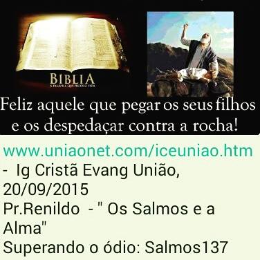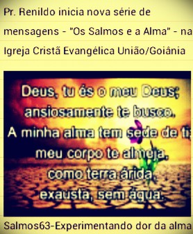 Pr.Renildo inicia nova série de mensagens - " Os Salmos e a Alma" na Ig Cristã Evangélica União . Salmos 63 : EXPERIMENTANDO A DOR DA ALMA - Escrito em uma das fases mais dificéis de Davi, qdo teve de lutar contra o seu próprio filho. A primeira atitude foi buscar ardentemente a presença de Deus, depois olhar quem Deus é : forte e glorioso...e então ao percebe a Graça de Deus , assumindo uma posição de louvor. Mesmo na luta conseguiu mergulhar na intimidade de Deus .