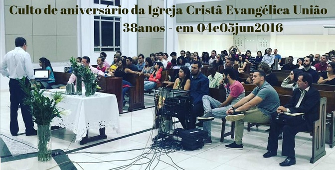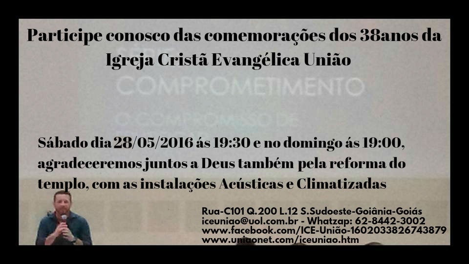Campanha para revestimento acústico da Igreja Cristã Evangélica União Alvo : 80mil Reais Venha participar conosco para melhorarmos as condições de recebermos os nossos vizitantes Rua-C101 Q.200 L.12 S.Sudoeste-Goiânia-Goiás - Fones : 62-9379-1479 e 8210-3863. www.uniaonet.com/iceuniao.htm - iceuniao@uol.com.br Participe conosco das comemorações dos 38anos da Igreja Cristã Evangélica União Sábado dia 29/05/2016 ás 19:30 e no domingo ás 19:00, agradeceremos juntos a Deus também pela reforma do templo, com as instalações Acústicas e Climatizadas . Rua-C101 Q.200 L.12 S.Sudoeste-Goiânia-Goiás iceuniao@uol.com.br - Whatzap: 62-8442-3002 www.facebook.com/ICE-União-1602033826743879 - www.uniaonet.com/iceuniao.htm ![]() Comemorações dos 38anos da Igreja Cristã Evangélica União : 4e5jun2016 , agradecemos Deus também pela reforma do templo, com as instalações Acústicas e Climatizadas . www.facebook.com/iceuniao - www.uniaonet.com/iceuniao.htm Os Preletores : Pr.Jailson