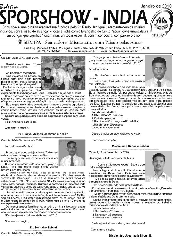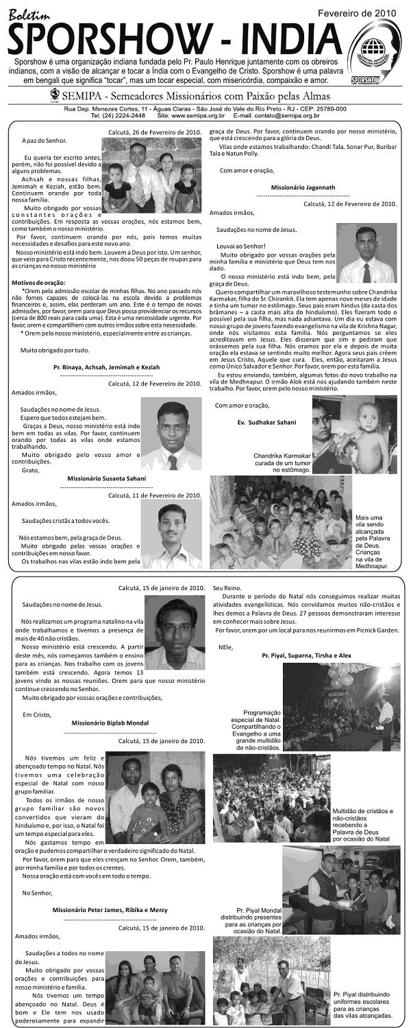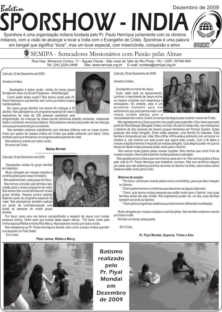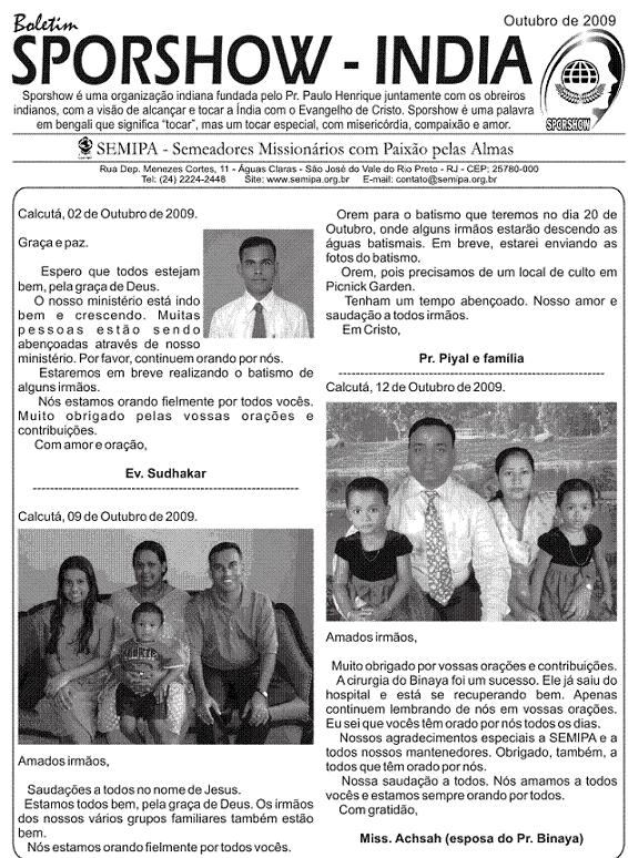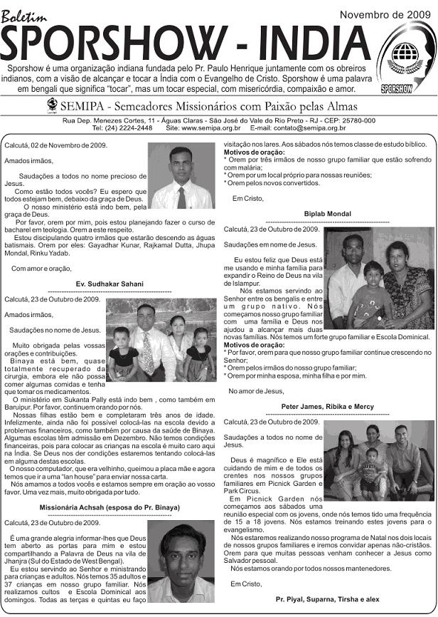 19 - Saída do Brasil (manhã) Quarta-feira 20 - Chegada na índia (noite) Quinta-feira 21 - Reunião obreiros (Calcutá) Sexta-feira 22 - Reunião obreiros (Calcutá) Sábado 23 - Reunião obreiros (Calcutá) Domingo 24 - Binaya e Sudhakar Ministry Segunda-feira 25 - Piyal Ministry Terça-feira 26 - Piyal Ministry Quarta-feira 27 - Piyal Ministry Quinta-feira 28 - Binaya Ministry Sexta-feira 29 - Piyal Ministry Sábado 30 - Piyal Ministry Domingo 31 - Igrejas em Calcutá 1 - Ida para Varanasi (noite) 2 - Chegada a Varanasi (manhã) 3 – Saída de Varanasi (noite) 4 – Chegada Calcutá (manhã) 5 - Sudhakar Ministry 6 - Sudhakar Ministry 7 - Binaya Ministry 8 - Binaya Ministry 9 - Encontro - obreiros e famílias 10 - Reunião obreiros (Calcutá) 11 - Saída da Índia (madrugada) 12 - Chegada ao Brasil (manhã) Segue em anexo o Boletim Sporshow _ Outubro de 2009, com as cartas dos obreiros indianos. O arquivo está em PDF. Pode abrir sem medo. Em Cristo, Pr. Paulo Henrique e família - - - São José do Vale do Rio Preto / RJ, 18 de Outubro de 2009. “Mas quem se gloriar, glorie-se nisto; em compreender-me e conhecer-me, pois eu sou o Senhor e ajo com lealdade, com justiça e com retidão sobre a terra; pois é dessas coisas que me agrado, declara o Senhor” (Jr 9.24) Amados irmãos e companheiros na obra missionária, Graça e a paz da parte de nosso Senhor Jesus Cristo. Aqui estamos todos bem, graças ao nosso Bom Deus. Apesar dos desafios, podemos dizer que “até aqui nos ajudou o Senhor”. Junto com esta carta, estamos enviando, para todos nossos mantenedores e intercessores, uma foto da nossa família, para que possam sempre estar lembrando de todos nós. Somos muito carentes de vossas orações e do vosso apoio. Temos acompanhado o trabalho na Índia que segue avançando em nome de Jesus. Se Deus quiser, no próximo mês estarei enviando também uma foto (montagem) com todos os obreiros indianos debaixo de nossa liderança, que agora somam sete. Quero agradecer a todos que oraram pelo Pr. Binaya. SEMIPA enviou o valor necessário para a cirurgia, que já foi realizada e agora ele já se encontra em casa, se recuperando da mesma. Por favor, continuem orando pela sua completa recuperação. Neste mês comecei um curso de Design e Web na cidade de Teresópolis. Eu já venho utilizando muito dos meus poucos conhecimentos nesta área na obra do Senhor, em especial na obra missionária, agora estou tendo a oportunidade de aperfeiçoar estes conhecimentos. Outra grande vitória foi que eu consegui o registro na FENAI (Federação Nacional de Imprensa) por estar escrevendo para o Jornal Paixão pelas Almas há mais de 15 anos. Estarei recebendo minha carteira de jornalista, que tenho certeza, vai ser útil na obra do Senhor. Estas vitórias têm sido alcançadas com esforço, dedicação e, vocês são participantes de cada vitória alcançada. A Deus seja toda glória! Lembramos que através de nosso blog (www.seara-italia.blogspot.com) vocês poderão encontrar nossas cartas informativas, várias matérias, vídeos, fotos e muito mais. Também no meu perfil do orkut vocês poderão encontrar cerca de 700 fotos. Somos profundamente gratos a todos amados irmãos que têm, com fidelidade, orado e contribuído para o nosso ministério. Até aqui, temos vencido muitos desafios juntos e com certeza estaremos vencendo muitos outros, em nome de Jesus. Muito em breve, estaremos chegando na Itália, com vossas orações e apoio. Obrigado a todos por estarem conosco em todos os momentos, segurando as cordas da oração e da contribuição. “Portanto, meus amados irmãos, mantenham-se firmes, e que nada os abale. Sejam sempre dedicados à obra do Senhor, pois vocês sabem que, no Senhor, o trabalho de vocês não será inútil” (1 Co 15.58 NVI). Com gratidão, Pr. Paulo Henrique, Alessandra, Matheus e Lucas