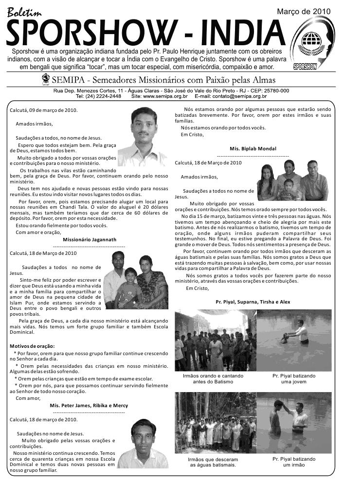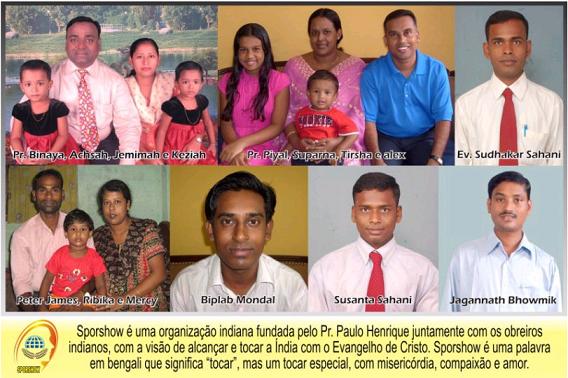 - INDIAFevereiro de 2008Sporshow é uma organização indiana fundada pelo Pr. Paulo Henrique juntamente com os obreiros indianos, com a visão de alcançar e tocar a Índia com o Evangelho de Cristo. Sporshow é uma palavra em bengali que significa “tocar”, mas um tocar especial, com misericórdia, compaixão e amor. Boletim Calcutá, 21 de janeiro de 2008. Saudações no nome maravilhoso de Jesus. Muito obrigado pelas suas orações e contribuições. Estamos fielmente orando por todos vocês. Achsah e nossas filhas estão bem. O ministério está indo bem. Em outra carta vou mandar algumas fotos. A situação em Orissa está muito pior. Muitos crentes estão debaixo de um tempo de dificuldades e perseguição. Eles perderam tudo: suas casas, roupas e muitas coisas. Porém Deus é grande e fiel. Ele está no controle de todas as coisas e trará um dia, paz e felicidade para a vida destes irmãos. Nós somos muito gratos pelas vossas ferventes orações. Por favor, lembrem-se em suas orações da irmã mais velha de Achsah (minha esposa). O nome dela é Bimla. Ela tem apenas 27 anos e seu marido morreu no dia 24 de janeiro. Por favor, orem por esta família enlutada. Com amor e oração, Pr. Binaya, Achsah, Jemimah e Keziah ----------------------------------------------------- Calcutá,