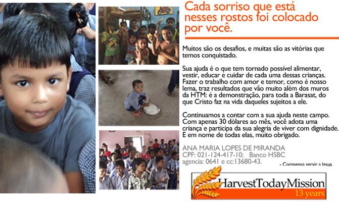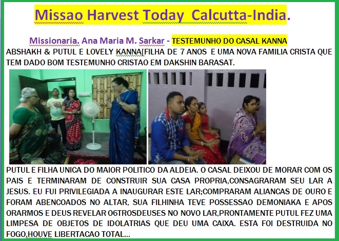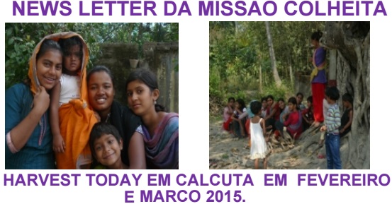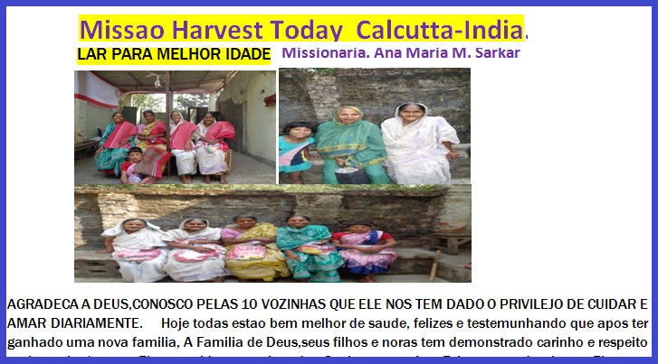 em paz. Contamos com você. Abraços, Renato 07/05/2016 - Missao Harvest Today Calcutta-India. Missionaria.15/04/2014 - Amados intercessores e mantenedores Graca e Paz da familia Harvest Today in Kolkata. Obrigada pelo vosso amor pratico, Isto e FE em acao!!! Temos a alegria de mandar as noticias de campo. EBENEZER!!!! Nos