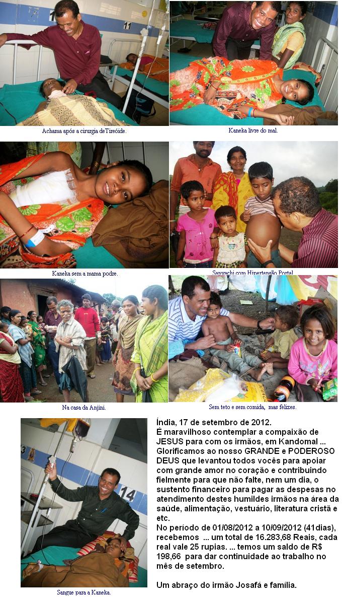 do norte da Índia até Kandomal-Orissa: 23.850 rupias. 2- Passagens de ônibus de Kamdomal-Bhubaneswar, ida e volta, para os irmãos enfermos, Menoti, Sibaram, Rintu, Sumanso, Amam, Biskewar, Pr. Surendra, Omio, Pitika, Motura, Robichandro, Chichila, Rita, Anish, Rupali, Srimati, Kastori, Pr. Bispessan, Sauni, Rajanikanta, Misra, Pr. Bhramar, Samar, Sansar, Nomati, Manoj, Pr. Hassanta, Mithi, Dito, Champaboti, Ochama, Kabita, Apsari, Alisha, Layla, Santa, Jichaia, Jisadas e mais 22 acompanhantes para tratamentos diversos: 29.240 Rupias. 3- Despesas com alimentação para os 39 enfermos e os 22 acompanhantes, durante todos os dias que ficaram na capital para tratamentos, com alimentação especial para alguns irmãos desnutridos: 28.824 Rupias 4- Transporte local para todos os deslocamentos de vários dias para três hospitais na capital, para a realização de todo atendimento e acompanhamento nas diversas áreas dos 39 enfermos já citados acima: 11.120 Rupias. 5- Despesas com consultas e exames oftalmológicos e compra de óculos para a irmã Motura: 1. 134 Rupias. 6- Pagamento das consultas, internação, exames, cirurgia e medicamentos usados no tratamento da Rita para retirada do útero: 10.235 Rupias. 7 - Pagamento das consultas, exames, internação, cirurgia, medicamentos para a irmã KASTORI, com grave problema na coluna: 12.568 Rupias. 8 - Pagamento de exames, medicamentos para a primeira cirurgia no ANISH, com grande problema nos rins: 11. 670 Rupias. 9 - Pagamento dos exames, internação, medicamentos para a segunda cirurgia da ISHANA que nasceu sem o ânus: 9.718 Rupias. 10 - Pagamento de consultas, exames, cirurgia e medicamentos para a irmão BISPEWAR com sério problema urológico: 7.452 Rupias. 11 - Pagamento das consultas, exames, internação, cirurgia e compra dos medicamentos para o irmão ROBICHANDRO para retirada dos anéis da perna e livramento da grave infecção: 10.470 Rupias. 12 - Pagamento das consultas e medicamentos para o irmão SANSAR: 780 Rupias. 13 - Pagamento das consultas, exames, medicamentos e óculos para a irmã NOMATI para preservação de 15% que ainda tem de visão: 1.308 Rupias. 14- Pagamento das consultas, exames, medicamentos e óculos para a primeira etapa de tratamento da visão do irmão MANOJ que já está cego de um olho e outro sendo tratado: 2.660 Rupias. 15- Pagamento das consultas, exames e compra de medicamentos para a irmã KABITA com sérios problemas ginecológicos: 1.558 Rupias. 16- Pagamento das consultas, exames, e compra do óculos para o Pr. Hassanta e compra de medicamentos para outros problemas de saúde dele e dos dois filhos ALISHA e JICHAIA: 2.860 rupias. 17 - Pagamento da consulta, exames, medicamentos, alimentação especial para a primeira etapa de tratamento da MITHI que tem tuberculose em fase terminal: 2.527 Rupias. 18 - Pagamento de 20 sessões de Radioterapia para MENOTI, para o combate ao câncer proveniente do Tumor da tireóide: 63.000 Rupias 19 - Compra de medicamentos no retorno de um mês do irmão OMIO que fez cirurgia com infecção grave no ouvido (tímpano destruído): 1. 270 Rupias. 20 - Pagamento de exames e medicamentos no tratamento da irmã APSARI que sofre com problemas no cérebro : 1.900 Rupias. 21- Compra de medicamentos no retorno do SIBARAM que fêz, em maio, cirurgia de apendicite: 949 Rupias. 22 - Pagamento dos exames, medicamentos para o Pr. BHRAMAR que sofre com Febre Tifóide, Malária, Insônia, Dores de cabeça e emagrecimento: 6.250 Rupias. 23 - Pagamento da internação, medicamentos, exames e compra de sangue para a LAIYA com hemoglobina baixa, malária e febre tifóide: 4.280 Rupias. 24 - Despesas com a primeira cirurgia odontológica realizadas nos irmãos JISSADAS e irmã SANTA: 1.937 Rupias. 25 - Despesas com a segunda cirurgia, na área odontológica, para o Pr. BISQUESSAM e CHICHILA, e colocação de prótese dentária nos dois: 4.600 Rupias. 26 - Pagamento de medicamentos, no retorno do PITIKA, que fêz cirurgia de hemorróida e hérnia: 1. 389 Rupias. 27- Consulta, exames, medicamentos e todo procedimento para a terceira etapa de tratamento do SUMANSO, com hipertensão portal e tuberculose na barriga: 6. 340 Rupias. 28 - Pagamentos de medicamentos e procedimentos, no retorno do AMAM, que fêz cirurgia na perna, no mês de maio: 2. 000 Rupias. 29 - Compra de medicamentos no retorno dos irmãos Pr. SURENDRA e o RINTU que fizeram cirurgia no mês de maio: 1.406 Rupias. 30 - Pagamento de consulta, exames e medicamentos para o tratamento da SRIMATI e sua filha RUPALI com sérios problemas de alergia: 1.480 Rupias. 31 - Pagamento das consultas e alguns exames preliminares para as irmãs OCHAMA, CHAMPABOTI, SAUNI, que farão cirurgia de tumor de tireóide em agosto: 1.540 Rupias. 32 - Pagamento de consultas e alguns exames preliminares para os irmãos que farão cirurgia, neste mês de agosto, MISHRA(Ortopedia), CHAMPI (Retirada do útero) eTARABATI (Retirar pedra da vesícula): 3.530 Rupias. 33 - Pagamento de consultas e medicamentos para os RAJANIKANTA (Cabeça) e DITO (Implante no braço): 1.100 Rupias. 34- Restante do pagamento das despesas para fabricação de uma cisterna para 23 famílias em Sarigudah: 15.000 Rupias. 35 - Gastos com comunicação, internet e telefone: 3.600 Rupias. 36 - Despesas de transporte para as diversas vilas de Kandomal para compra de mercadorias, visitação, triagem e atendimento a enfermos: 4.520 Rupias. 37 - Compra de 280 kilos de alimentos não perecíveis (arroz, lentilha, óleo, açucar e outros) que beneficiaram 11 famílias pobres em Kandomal e entre os refugiados na favela da capital: 5. 850 Rupias. 38 - Compras de chinelos, colchonetes, esteiras, produtos de higiene pessoal, para apoio aos irmãos levados para tratamento: 2. 780 Rupias. 39 - Gastos com nossa equipe (Josafá e Hadassa) com alimentação e hotel: 14.300 Rupias. Total geral de gastos em Rupias: 316.995 rupias. (Trezentos e dezesseis mil e novecentos e noventa e cinco Rupia