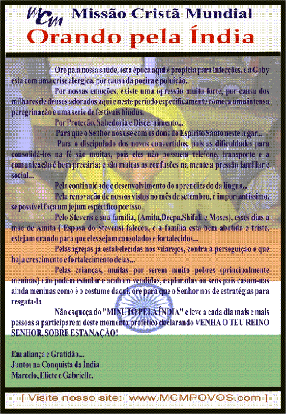 = = = 11/09/06 Amados intercessores Durante um ano e meio estivemos na India, no propósito que Deus nos deu de implantar igrejas e formar obreiros nativos, porém necessitamos voltar ao Brasil para a renovação de nossos vistos, ja estamos nesta batalha a cerca de 4 meses, e nesta semana estaremos enviando a documentaçao para a aprovaçao de nossos vistos de retorno, estamos pedindo 5 anos e crendo em um milagre, contamos com suas oraçoes especificas neste sentido ate que tenhamos a liberaçao destes vistos, pois sabemos que venceremos essa Batalha no Mundo Espiritual!!! Queridos aproveitamos para conviadá-los e estarem conosco num grande despertamente de oração pela India que temos chamado de MINUTO PELA INDIA, se dispondo a orar pelo menos um minuto pela India todos os dias e declarar " Senhor Jesus Venha o teu reino sobra a India", Junte-se a nos e contagie sua igreja a estarem neste mover!!!! Em Aliança e Gratidão Juntos na Conquista da India : Marcelo_Eliete/Varanazi Recentemente recebi em minha casa uma missionária que esteve na India e Timor por alguns anos, foram duas semanas de muita troca de experiências, aprendizado e sobre tudo de muita reflexão. Foi muito edificante ouvir os testemunhos e as experiências que Deus lhe proporcionou no campo, entre tantas coisas que partilhamos, gostaria de compartilhar com você este texto fruto de uma experiência que ela teve na India. Desejo que o Espírito Santo quebrante o seu coração através das linhas deste texto. No amor do Pai, Adna Que virá a ser então, este menino? Ele não tinha mais que 8 anos, usava uma calça vermelha e uma blusa que há muito tempo atrás teria sido branca. Sua pele era morena, seus olhos negros, tinha os dentes bem branquinhos. Era um menino forte pois carregava nos bracos uma bacia de ferro cheia de brasas. Era um menino corajoso, não tinha medo do fogo, do perigo pois ele mesmo havia tirado as brasas da fogueira. Era um menino determinado, tinha um lugar certo para deixar aquelas brasas. Caminhava um pouco, dava algunas passos e parava para recuperar suas energias. Sua parada nao era longa pois as brasas poderiam se apagar. E assim o menino prosseguia o seu caminho. Eu o observava e quando ele percebeu isso me olhou e me deu um largo sorriso. Talvez pensasse " porque essa estrangeira me olha?" caminhou alguns passos, olhou para atrás e sorriu novamente. As brasa que ele carregava poderiam ser para acender uma fogueira para aquecer o seu corpo pois era inverno, poderia ser para preparar algum alimento pois era hora do jantar, mas esse nao era o caso. Eu estava a beira do Rio Ganges e aquele menino carregava aquelas brasas para acender uma nova fogueira para cremar um outro corpo numa cerimonia hindu. Naquele momento veio a minha mente o versiculo de Lucas 1:66 que diz " Que vira entao a ser esse menino?" Pensei no seu futuro, como um flah pude ver sua adolescência, quais seriam suas perspectivas vivendo naquelele ambiente? Talvez se torne um sadhu, um guru, com certeza ele sera mais um dos praticantes do hinduismo popular. Só Deus podera mudar o destino desse menino e de outros milhares que vivem na India nas mesmas condições. Ele porém quer usar a sua vida para abençoar essas criancas, o futuro dessa nação. O Senhor te pergunta: A QUEM ENVIAREI? (Is. 6.8) Talvez você nunca seja enviado ao campo missionário, mas de maneira bem prática você pode estar envolvido! Você pode orar, contribuir para que o Reino de Deus seja estabelecido na vida dessas crianças. Será que como Isaias você pode dizer eis-me aqui Senhor!!!!! LUCI MARA PEREIRA Varanasi, India 2002 www.wemonline.org