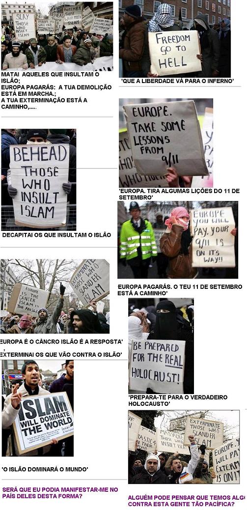 a isto Religião tolerante? Estas fotos foram tiradas durante a manifestação d' A religião da paz recentemente celebrada pela comunidade muçulmana, em Londres. Não se publicou na imprensa nem na tv para não ofender ninguém... MATAI AQUELES QUE INSULTAM O ISLÃO; EUROPA PAGARÁS: A TUA DEMOLIÇÃO ESTÁ EM MARCHA.; A TUA EXTERMINAÇÃO ESTÁ A CAMINHO,..... DECAPITAI OS QUE INSULTAM O ISLÃO 'EUROPA É O CÂNCRO ISLÃO É A RESPOSTA' , 'EXTERMINAI OS QUE VÃO CONTRA O ISLÃO' 'O