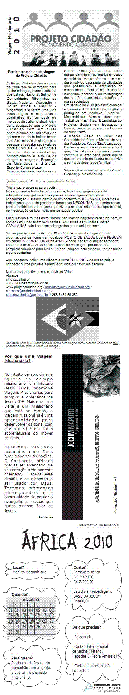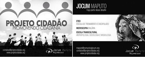 Mensagens em Ingles ( ver : www.uniaonet.com/jocumocambiqueingles.htm ) 01. ) Conhecendo o Projeto Cidadão - Brasil - África 02. ) Ator Global Ademir Zanyor 03. ) Expedição Para a Africa Maputo Moçambique - Julho de 2010 04. ) Começará em agosto de 2010 uma ETED Bilingue 05. ) UPG's in our region 06. ) Final teórico Eted Jocum 07. ) movimento de plantacao de igrejas (MPI) 08/04 08. ) Fundamentos do Ministério de Aconselhamento - FMA 10/04 09. ) Jocum Dondo (25/04) 10. ) Carta Ruth (26/04) 11. ) Ficha de Inscrição para ETED ( ver : www.uniaonet.com/jocumformularios.htm ) 12. ) Casa Re-OM (01/05) 13. ) Folder Viagem Missionária 2010 14. ) Das Nações para as Nações - 04/06/2013 15. ) University of the Nations Catalogue 2014 - (14/07 16. ) Manutenção dos Obreiros - ( 15/07 17. ) Projeto Amigos do Rei - 27/07 18. ) Dinâmica - 17/08 19. ) Projeto Cidadão - 15/09/2013 01. ) Conhecendo o Projeto Cidadão - Brasil