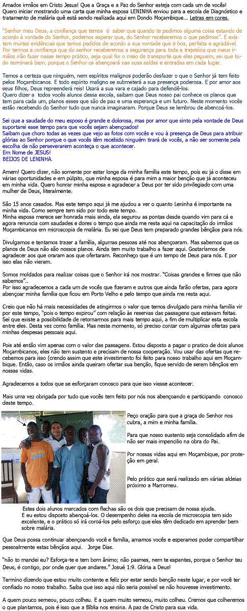 = = =Justificativa: Eu particularmente tenho já vivido experiências incríveis aqui com o Senhor. Meu coração é missões e se Deus nos chamar para iniciarmos um trabalho aqui na África, eu quero mais é fazer a vontade d'Ele. Tenho consciência de que nosso descanso é na eternidade e que receberemos o galardão da promessa. Por isso desejo que minha esposa e filhas estejam aqui, para que Deus fale com elas o mesmo que quer falar comigo. E o outro motivo é que até Outubro não é aconselhável que fiquemos assim separados. Somos uma família em missões na seara do Pai. Precisamos um do outro. Mais uma vez agradecemos o carinho que temos recebido de você. Esperamos que haja um envolvimento maciço do corpo de Cristo em amor pelos africanos. A fim de sermos testemunhas tanto em Jerusalém como em toda a Judéia, Samaria e até aos confins da terra. Um grande abraço do seu irmão em Cristo Jorge Dias Ferreira. Queridos amigos e irmãos em Cristo! Que a graça do Senhor possa estar superabundando em seus corações! Quero falar sobre um Pr. Moçambicano que conheci aqui. Pr. Bonga. Conheci na festa que teve para as crianças que estavam aniversariando, esta festa foi realizada na Base de Jocum Dondo, onde também tem um infantário para crianças bem pequenas. Ele trabalha com crianças e jovens, creio que órfãos. Está também envolvido com o infantário, um tipo de orfanato com o qual a Jocum daqui de Dondo vem trabalhando. Na nossa conversa e apresentação nos pediu para ficar aqui e ajudar o povo dele a conhecer o Amor de Deus.. Falou das comunidades em redor e derredor de Dondo, e como que o trabalho com malária seria útil somando com a evangelização. Confesso que me partiu o coração pelo fato de eu estar vivendo este momento aqui. Portanto, oro e peço oração para que Deus nos dirija como bem parecer aos seus olhos. Continuo com muita fé de que minha família estará aqui para sentir este campo missionário. Neste dia (12-08-08), O técnico Ilídio do laboratório de Dondo disse que temos feito um excelente trabalho aqui. De dar importância ao povo Moçambicano e assim contribuir para que mais comunidades recebam a visita para diagnóstico e tratamento da malária. Claro que não estamos formando apenas microscopistas, estamos formando pessoas que tenham a mente de cristo. Neste tempo tenho aproveitado para testemunhar para ele. Um jovem do curso que não era cristão estava fazendo a escola. E depois de falarmos da perspectiva Bíblica sobre a Cosmovisão em relação a malária, iniciou-se uma série de ministrações durante o curso. E ele procurou Outra aluna que tem um maravilhoso trabalho aqui em Moçambique e disse que queria aceitar Jesus. Foi sem dúvida a melhor coisa que aconteceu na escola. Quero agora aproveitar e apresentar aqui um trecho de um email que recebi de uma irmã em Cristo, que não nos conhece pessoalmente, mas se tornou uma parceira neste projeto contra malária – África. Quero com isso passar como um relatório do que Deus continua fazendo em nossas vidas... Olá Miss. Jorge Depositei uma ajuda para a necessidade de vcs, o equivalente a U$ 200,00 (duzentos dólares), ou seja, R$ 315,00 (trezentos e quinze reais), espero que possa ser útil e o Senhor possa multiplicar. Desejo que o Senhor toque outros corações que possam ajudá-los também. No amor do Senhor. Sandra Lúcia Cavalcanti-Coord. Do Parceria Missionária. Com isso permanecerei crendo neste Deus maravilhoso de que minha família estará aqui comigo para pisar com as plantas de seus pés nesta terra e profetizá-la como herança ao Senhor. "O povo que andava em trevas viu grande luz, e aos que viviam na região da morte, resplandeceu-les a luz". Que Deus possa abençoar grandemente sua vida e de sua família. Pois a esperança que vê não é esperança. Pois o que se vê como o esperará? Portanto continuemos a correr a carreira que nos está proposta. Jorge Dias e família. 19. ) wladimir santos da silva _ Essa semana recebemos uma carta do missionário Jorge que está em Moçambique. Ele tem desenvolvido um importante trabalho lá com evangelização e um projeto contra a Malária. Porém ele precisa que sua esposa (Leninha) e que suas duas filhas (Jakeline e Gabriele) estejam com ele. Eles são missionários de JOCUM-Porto Velho e estão precisando muito de nossa ajuda: atualmente eles precisam de cerca de R$ 15.000,00 para custear as passagens de ida e volta, os vistos, e a moradia e alimentação da família até o mês de outubro! Só as passagens custarão R$ 11.030,00; A hospedagem e a alimentação custarão cerca de R$ 3.040,00. Gostaríamos de levantar 300 pessoas dispostas a ofertar uma única com R$ 50,00. Caso vc possa ofertar um valor maior, esteja a vontade! Mais informações e ofertas: www.ssam.com.br (Missionário Jorge Dias e Família) Desde já agradecemos! Ore por essa família e ministério! Serviço de Informações SSAM (62)8178-5617 / 8147-1797