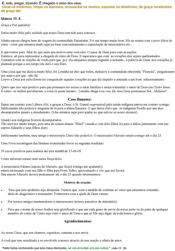 26. Malária na Com Indigena Banawa/AM (13/06/2009) 17/06/2009 Querida amigos! Graça e Paz! Peço perdão por mandar um email em massa para vocês.. Confesso que desejaria enviar individualmente.. Sei que alguns receberão novamente por estarem tambem neste grupo.. ams peço sua paciencia... A Correria aqui não está pra brincadeira.. É sobre o caso Banawa.. Desde de já agradeço o carinho e a maneira como os irmãos tem amado a Obra missionária.. Deus abençoe vc e sua familia.. Por vafor orem por nós...