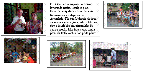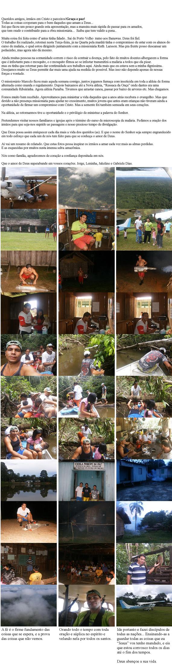 28. ) 3 de setembro de 2009 Jorge e Leninha Olá queridos irmãos e parceiros no nosso novo Projeto. DESDE. D= DISCIPULADO, E= EVANGELISMO, S= SAUDE INTEGRAL, D= DESENVOLVIMENTO COMUNITÁRIO, E= EDUCAÇÃO. três deste projeto tem sido aplicado. o que ainda falta é uma melhoria no desenvolvimento comunitário. uma das razões é falta de unidade geral das duas aldeias que ficam no mesmo rio Ipixuna. Mas acreditamos que esta barreira está sendo quebrada, pois houve seis novas decisões à Cristo, e destas representantes das duas aldeias. Vamos orar para que seja quebrado o egocentrismo e que opere mais a unidade. Nosso tempo com a familia de minha esposa foi muito bom. Claro que não foi só ferias.. Foi-me pedido para fazer um trabalho de malária para o curso que será dado agora em Setembro para uma comunidade ribeirinha no baixo rio Madeira ainda na região de Rondônia. então, durante um mes eu montei as aulas do curso de malária, fiz a gravação e mandei para Porto Velho. Meu cunhado que mexe com gravações me deu a maior ajuda.. fez uns arranjos com fundo musical.. recebí a informação que ficou muito jóia. Queremos assim continuar agradecendo sua participação e apoio. Deus abençoe sua vida.