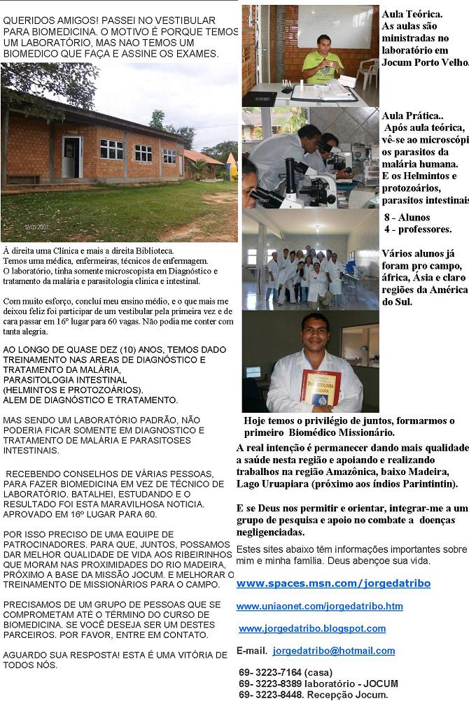 25/09/2011 Jorge Dias Uma ventania daquelas que ninguém merece, resultado: um dia sem energia, aproximadamente 8 árvores cairam, telhas arrancadas, sem poder fazer pesquisa para faculdade "provas", mas em tudo dai graça, pois essa é a vontade de Deus em Cristo Jesus. agora é limpar aos poucos os estragos feito pela natureza.. e o ser humano aida continua explorando-a de forma errada, parece não ter aprendido ainda.... 32. ) Olá meus amados (as) irmãos (ãs) amigos e cooperadores e parceiros! Graça e Paz! Venho por meio desta expressar nossa gradidão pela grande expressão de amor vindo da parte de atravez da vida dos amados irmãos. Segue anexo em PDF nossa manifestação e pedidos de oração. Pois vamos continuar seguindo firmes até o fim pra glória de Deus. continuamos a contar com esta parceria dos amados, que sem a qual, não poderiamos sequer sonhar em crescer e melhorar, não só a qualidade de vida das comunidades por onde temos passsado mas poder de maneira prática demonstrar para as pessoas que Deus ama, quer salvar e se importa com o bem estar de todos, físico, emocional e espiritualmente. Tudo isso só tem sido possível primeiro porque tem sido a vontade do Senhor. Depois porque você tem estado junto conosco e podemos assim permanecer com o memso foco e visão. Por ultimo porque o Diabo tem tentado de todas as formas nos derrubar e nos fazer cair no comodismo e no fracaço para que possamos abandonar o chamado. mas em tudo temos sido mais que vencedores por aquele que nos chamos e amou. Temos uma equipe de liderança aqui na Jocum Porto Velho que tem sido instrumento de Deus para toda a Organização e por isso podemos crescer e aprender com todos eles. Bendito seja Deus pela vida dos nossos pastores e líderes. Deus abençoe a sua vida. - - - Aos queridos amigos e amados irmãos, Graça e Paz! Esta carta é para dizer mais uma vez MUITO OBRIGADO!! Graças a Deus encerrei o segundo período de Biomedicina sem nenhuma reprovação e muito menos fiquei para afinal de qualquer matéria. É o compromisso que tenho, primeiramente com Deus, e com os amados (as) irmãos (ãs) que me ajudaram até aqui com sua parceria, oferta de mui grande amor e voluntariedade, que me proporcionou ser fiel com os cumprimentos de meus deveres com a faculdade, pagando em dia. Tivemos algumas perdas consideradas em relação ao número de pessoas que ficaram de se juntar a nós para que pudéssemos seguir adiante sem necessidade de nos preocuparmos com outras coisas, mas entendemos que as coisas não estão nada fáceis para ninguém. Mas o que o Senhor nosso Deus fez é algo imensurável, como sempre, o Senhor é um Deus indescritível, Sublime e acima de todos os deuses. Surpreendeu-nos todos os meses, onde pessoas como você, foi instrumento abençoador vindo da parte de Deus para nossa vida. Pedimos a Deus, as mais ricas bênçãos para sua vida e para a vida de sua família. Não tem sentimento e nem palavras com as quais possamos agradecer. É algo de dentro de nosso coração. Reconhecemos o amor, o carinho, o sacrifício e a generosidade de cada irmão e irmã, que mesmo a grandes lutas e despesas nos proporcionou seguir em frente. Ainda para este mês de Dezembro e Janeiro, temos que continuar com o pagamento da faculdade. Fevereiro recomeça as aulas e já o 3° Período. Pedimos que, por favor, nos ajudasse em oração, eu não posso dizer outra coisa senão que foi um grande milagre do Senhor nosso carro ter agüentado o que ele agüentou, está fora de realidade acreditar que um gol quadrado 94 suportasse e ainda suporta grandes adversidades com uma manutenção antiga. Pois como dantes já havíamos comentado, nossa missão fica longe da faculdade e das escolas onde nossas filhas estão estudando. Nem penso em manutenção, mas em trocar nosso quadradão por um de 4 portas e ar, pois não se trata somente da faculdade, mas das crianças que vão todos os dias para a escola, aqui ou é muita chuva com lama pelo caminho no inverno, ou muito calor e muita poeira no verão... Desejamos um abençoado Natal para Você e família. Um ano novo renovado, repleto de bênçãos e novidades milagrosas vindo do trono do Senhor para você. Leninha e Gabriele estão lutando para irem à Paraíba. Eu e Jakeline devemos permanecer aqui na Base de Jocum Porto Velho. Gabriele e Jakeline foram muito bem na escola. Perspectiva de cursos para elas como informática ano que vem. Leninha Irá batalhar para fazer Letras para auxiliar nas escolas das comunidades Ribeirinhas. Enquanto eu devo montar equipes de saúde para o auxílio desta área nas respectivas comunidades. Tudo com a permissão do Senhor e segundo a sua vontade. Que o grande amor de Deus encha seu coração de muita felicidade e prosperidade.. No amor do Senhor, Jorge Leninha, Jakeline e Gabriele Bandeira Dias. 33. ) Jorge Dias 11/04/2013 _ logo logo estaremos teclando no pc.. relaxem aí.. está acabando a primeira parte de provas "N-1".. Tá osso!! mas vamos conseguir.. bjs a todos!! Semana de provas.. e bioestatística que tá me deixando careca.. aff!!! Mas vamos que vamos!! "Por favor nao deixem de orar conosco pela KOMBI.. continuamos na esperança que, ainda, se não vê.. pois a esperança que se vê não é esperança.. Ô glória! bjs..21 de março Minha ausência vai aumentar devido ao período de provas.. agora é hora de aumentar a concentração e fazer bonito.. bjs a todos vamos que vamos... - - Jorge Dias compartilhou a foto de Elinèia Hartmann. Segunda às 16:16 · Infelizmente perdemos uma colega "aluna " de microscopia de malária. Ela sofreu um acidente - estando ela em sua moto com um automóvel, expressamos nossos sinceros sentimentos a família. Que a graça de Jesus alcance seus corações.. Ela está com a mão sobre o globo. 34. ) 08/09/2013 _ Jorge Dias · A parte que cabe a minha querida tia Nair Luiza Pinto, no momento em que foi descansar no Senhor é esta.. "O velho crente é uma brasa viva, O velho 
