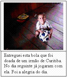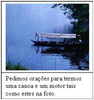 Jorge Dias Ferreira. (0xx) 69-3223-7164. Endereço: Caixa postal 441 CEP: 78900-970. Porto Velho-RO. E-mail. jorgedatribo@hotmail.com nossa conta é: Banco Brasil. Ag.0102-3 C p. 36162-3 Jorge Dias Ferreira. http://www.uniaonet.com/jorgedatribo.com.br 25. ) Queridos irmãos em Cristo! Graça e Paz! Estarei indo para Nossos Amigos Parintintin (Aldeia). Vou preparar Lugar (Hospedagem) para levar uma equipe. Mas estamos animados e esperamos contribuir com o bem estar da comunidade em todos os sentidos. Desejamos também iniciar a constrção de nossa casa na comunidade, mas como é tempo de muita chuva aqui, pode haver atrazo na obra. Pedimos oração por nossa familia. Deus abençoe a vida dos amados!! Jorge Dias e Familia. 16/01/2009 Só quero informar que dois indígenas morreram. Um de 18 e sua irmã de 15 anos.. Motivo: Um Relâmpago caiu e os pegaram. Graças a Deus, pude chegar até lá com a ajuda de amigos. E assim pude confortar e ajudar nos trabalhos do dia a dia da comunidade além de fazer os exames para detectar malária.. Louvamos a Deus por nos permitir ser tambem um socorro presente na hora da angústia das pessoas para abeçoá-las. Estaremos retornando à aldeia agora dia 06-02. Vamos pintar a escola e procurar abençoar um pouco mais aquela nação. ![]()
