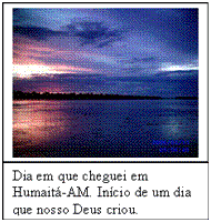 29. Família Bandeira Dias _ 27/11/2010 QUERIDA FAMILIA E AMIGOS! PASSEI NO VESTIBULAR PARA BIOMEDICINA.. O MOTIVO É PORQUE TEMOS UM LABORATÓRIO MAS NAO TEMOS UM BIOMEDICO QUE FAÇA E ASSINE OS EXAMES. POR ISSO PRECISO DE UMA EQUIPE DE PATROCINADORES.. PARA QUE, JUNTOS, POSSAMOS DAR MELHOR QUALIDADE DE VIDA AOS RIBEIRINHOS QUE MORAM NAS PROXIMIDADES DO RIO MADEIRA, PRÓXIMO A BASE DA MISSÃO. E MELHORAR O TREINAMENTO DE MISSIONÁRIOS PARA O CAMPO. AGUARDO SUA RESPOSTA!! ESTA É UMA VITÓRIA DE TODOS NÓS. 30. Família Bandeira Dias _ Pois já nasceu uma criança, Deus nos mandou um menino que será o nosso rei. Ele será chamado de "Conselheiro Maravilhoso", "Deus Poderoso", "Pai da Eternidade","Principie da Paz" Ele será descendente do rei Davi; o seu poder como rei crescerá, e haverá paz em todo o seu reino. As bases do seu governo serão a justiça e o direito, desde o começo e para sempre. No seu grande amor, o Senhor Todo-Poderoso fará com que isso aconteça. Esse é o sentido do Natal. Temos a certeza que o menino nasceu e na cruz foi consumado e Ele se encontra assentado a direita do pai e intercede por nós. E ele é quem nos reconcilia com Deus . Mantenhas confiante nessa palavra porque ela é verdadeira. Feliz Natal 31. Porto Velho 09/05/11. Queridos irmãos e amigos, o motivo desta carta é para expressar a nossa gratidão por vossa generosidade em nos apoiar. Nós acreditamos que o Senhor da gloria os recompensará em todos os aspectos. Também queremos lhes informar dos últimos acontecimentos no nosso ministério e família. Em relação à conferência de missões e fronteiras que tivemos no mês de abril foi de muito êxito. A nossa visão quanto aos não alcançados ficou mais vivo nos nossos corações. Nós agradecemos pelo o apoio financeiro que temos recebidos dos amados e por toda oração feita em nosso favor. Sempre em nossas orações lembramos-nos de pedir a Deus por todos e cremos que no tempo de Deus vocês receberão a recompensa. Também queremos informar que o Jorge está desempenhando muito bem com os estudos da faculdade. Apesar de que os estudos tem sido intensivo, ele está feliz e muito grato a Deus pelo apoio que vocês estão dando para que isso seja realidade. Não temos palavras para expressar a nossa gratidão. Por causa da vossa obediência as mensalidades estão em dias; uma vez mais nosso muito obrigado. Quanto a mim, Jakeline e a Gabriele; as meninas já concluíram o primeiro bimestre com êxito e já estão bem dedicadas para o próximo. Quanto a mim eu estou terminando o meu segundo grau escolar e tomando cursos extras como de costuras e estudos bíblicos. Como também atendendo nas necessidades da missão. Com certeza me sinto bem animada para continuar atuando juntamente com a equipe de professores para o ano que vem. Pois em 2012 teremos a Escola Multiétnica Bíblica para adultos indígenas aqui na base. E esse período de seminário foi para nos preparar para essa escola. Uma vez mais muito obrigado pela a sua obediência ao que Deus tem colocado nos vossos corações. E especialmente pelo amor que vocês expressão por nós e ministério. No amor de Cristo Jorge e Família 31. ) “... Aprovado para toda boa obra”. Queridos