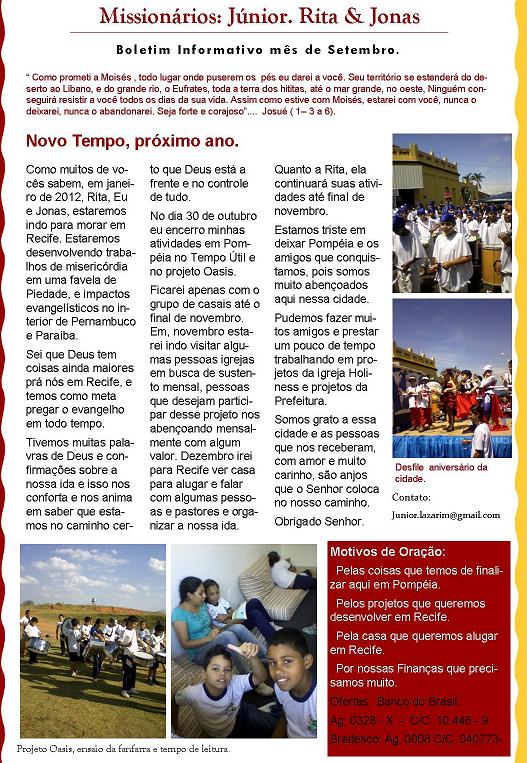 na festa junina de lá..." - Comin 6/2004Esposa Rita de Cássia R. Abreu Lazarim Filhos: Roberta R A. Lazarim 21 anos missionária Débora R A Lazarim 19 anos missionária e Jonas R A Lazarim com 12 anos tem a sindrome de Daw e é deficiente auditivo, mas uma benção no reino de Deus. Estamos na Jocum Recife; Endereço: Camaragibe PE. Cx. Postal 64 Cep- 54765-970 "...Lixão de Olinda/Recife - Uma família, entre as 300 que lá existem, foi abençoada com uma doação, e agora nós estamos derrubando o barraco velho dela e construindo um novo, que bom se mais gente pudesse orar a Deus e fazer o mesmo. Como é precária a vida nesse lugar, se existe inferno aqui na terra, um pedaço dele está aqui com certeza. Demolindo esse barraco, baratas de todos os tipos e tamanhos subiam por nossas calças, ratos, aranhas e um tipo de formiga muito estranha. As crianças desse lugar têm vermes e sarnas por todo corpo, além de feridas (sem remédio específico, até o momento). Quando chego no Lixão para trabalhar, me dá uma depressão que custa a passar, tal a miséria do lugar..." COMIN/6/2004 Junior e Rita _ novo E mail Queridos estou com um novo E mail da Jocum Recife, o endereço atual da hotmail ainda está valendo, e que é mais rápido e facil para mim acessar esse novo e mail. ANOTE O NOVO; . . . OBS; Não esqueça de quando enviar E mail p/ esse novo endereço COLOQUE no ASSUNTO: Junior e Rita ok. Um beijo a todos estamos bem graças a Deus. Deus os abençõe Junior e Rita 05/05/2004 April