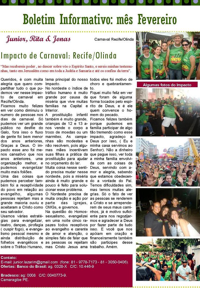 Rita, Eu, Roberta, Debora e Jonas, estamos bem de saude, e todos trabalhando. Na sexta-feira, a Roberta e Debora ir'ao p o Impacto de Carnaval em Salvador dois onibus saira de Recife com 100 jocumeiros, rumo a Salvador, com certeza Deus ira fazer muitos milagres naquele lugar. A debora ainda nao tem o dinheiro da viagem R$ 150.00, mas confiamos que ate sexta-feira o Senhor fara o milagre. Orem por ela p que consiga esse dinheiro. Rita, Jonas e Eu, ficaremos na base, intercedendo por todos que vao p Salvador. Orem por esse impacto, pois a batalha e grande. Amigos depois eu mando via E mail, os milagres que o Senhor vai fazer nesse impacto. Deus os abencoe muito. Obrigado por suas oracoes e contribuicao, e muito importante. Vcs, fazem parte desse trabalho em Recife e em Salvador. Deus os abencoe muito. Junior e familia (COMIN) = = = January